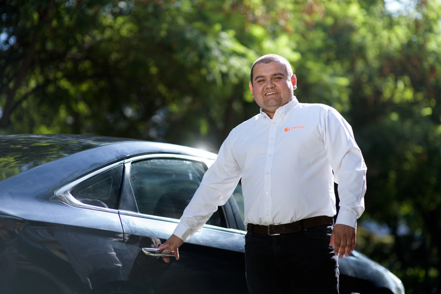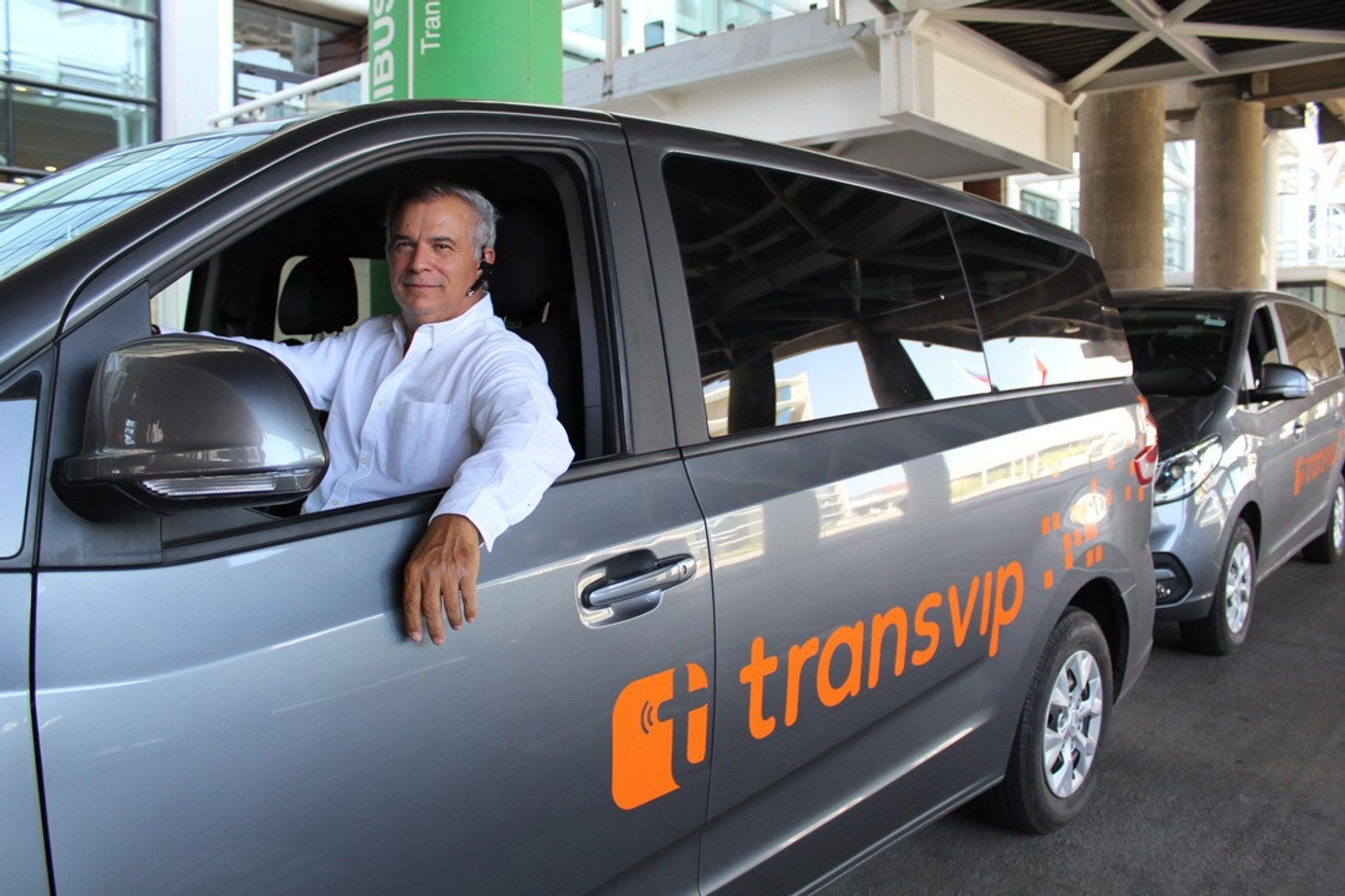 Passenger approaches the Transvip counter, where a representative confirms the reservation and assigns the vehicle.