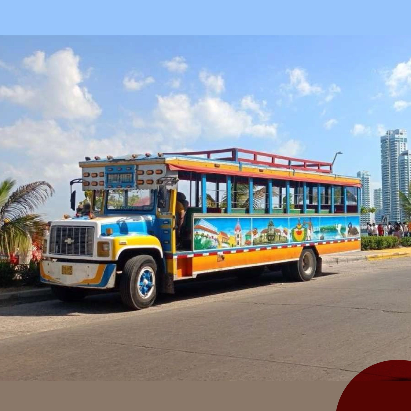 The Chiva will pick you up at your hotel in the areas of Bocagrande, El Laguito or Castillogrande to start the city tour, or we will meet at the Clock Tower or Parque Flánaga