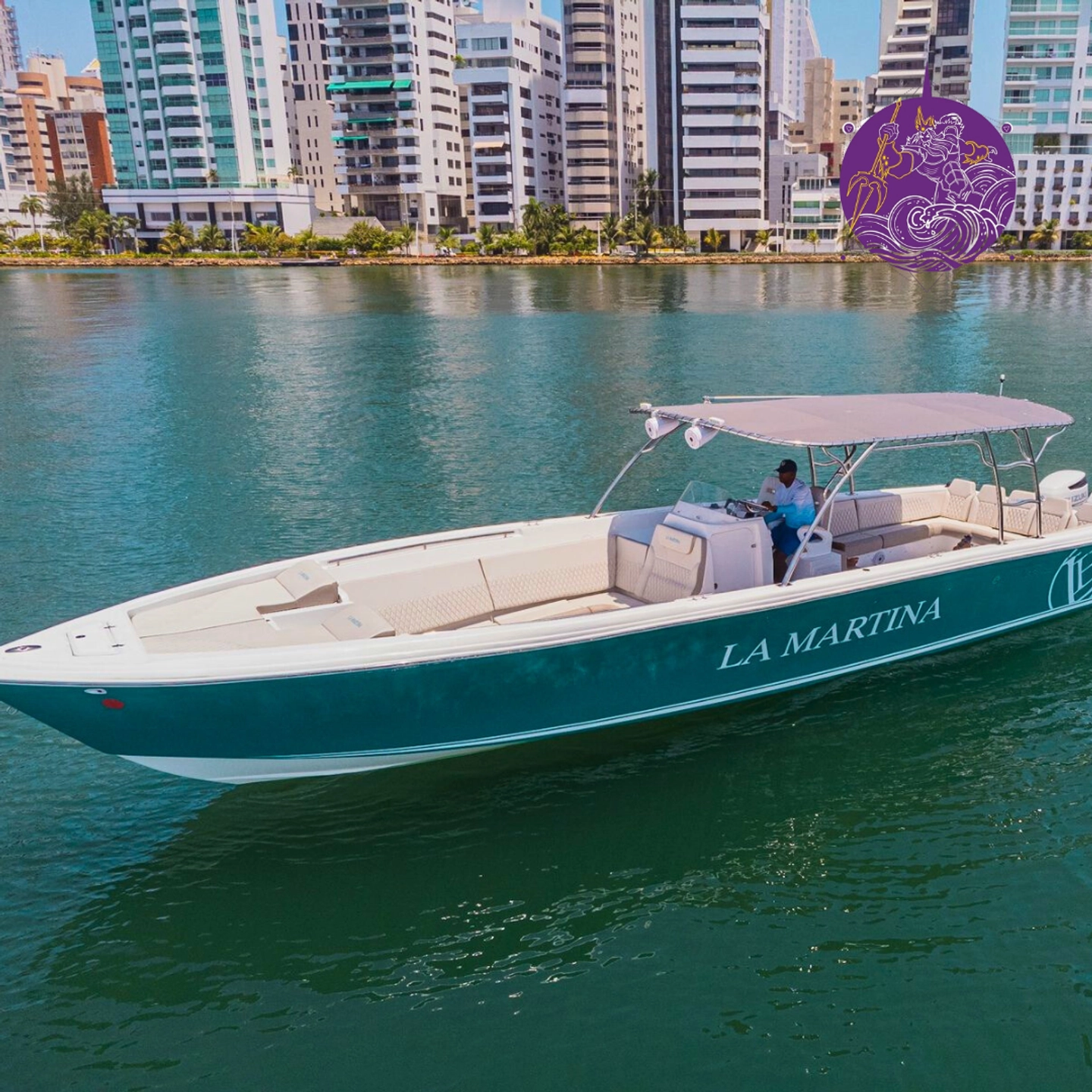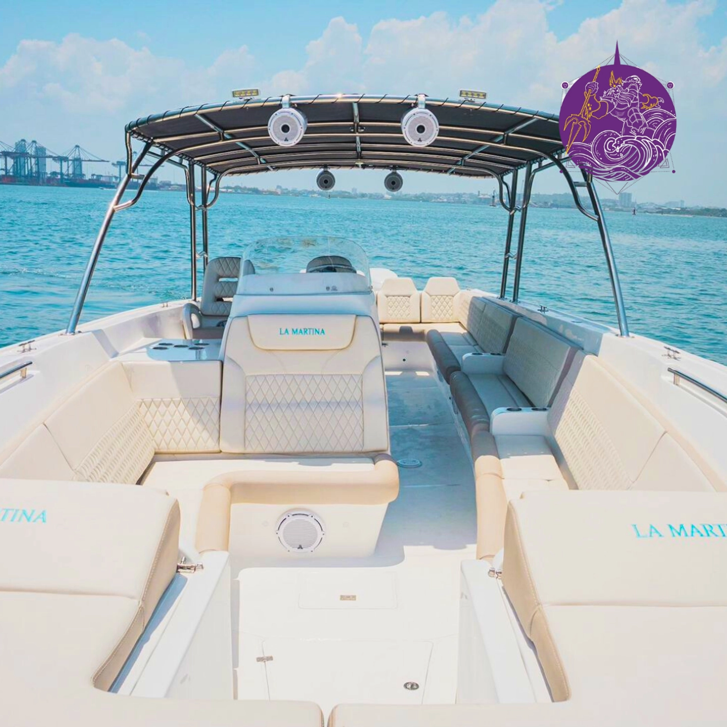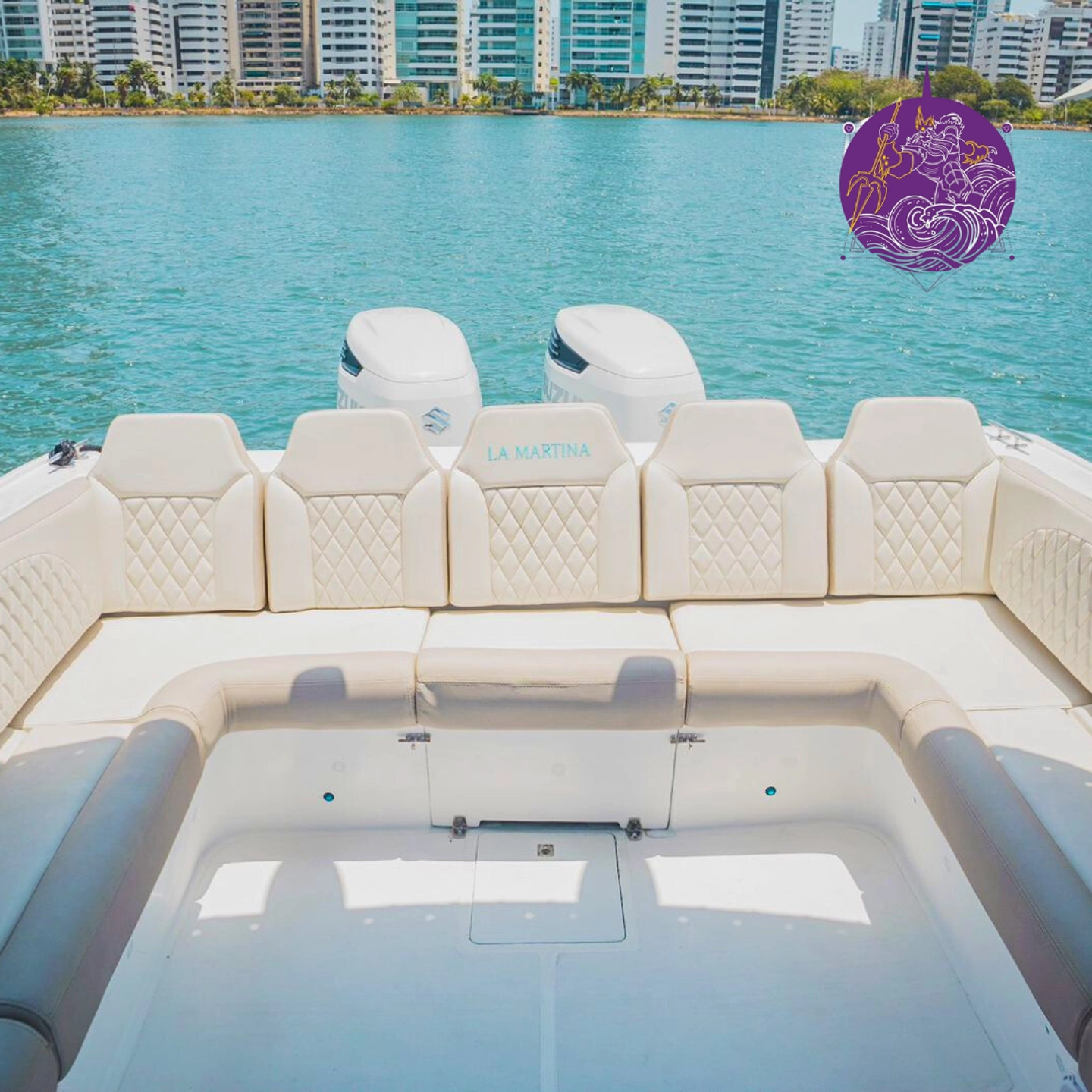 Experience an unforgettable sunset sailing to the Rosario Islands on a luxury sports boat. Enjoy the comfort and exclusive design of the La Martina boat, with premium music, an onboard bar, and a vibrant atmosphere. An ideal tour to relax, socialize, and capture spectacular views of the Colombian Caribbean as the sun sets.