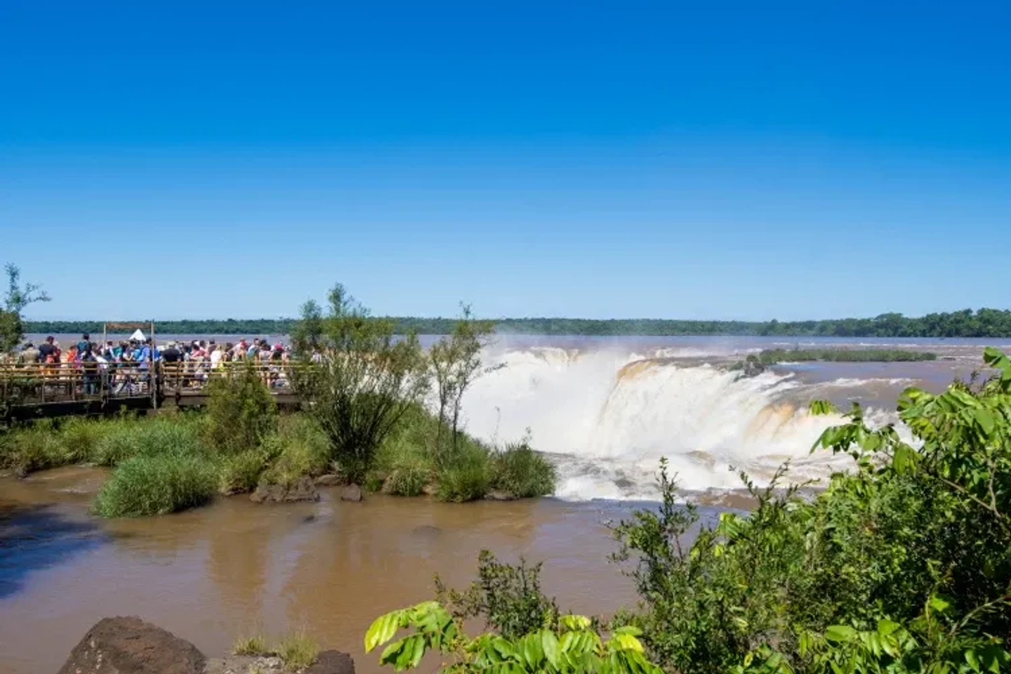 Recorre pasarelas con vistas panorámicas desde lo alto y siente la bruma de las cataratas en el circuito inferior. Accede en tren ecológico y pasarela sobre el río Iguazú hasta el mirador en herradura, el punto más impactante del parque.