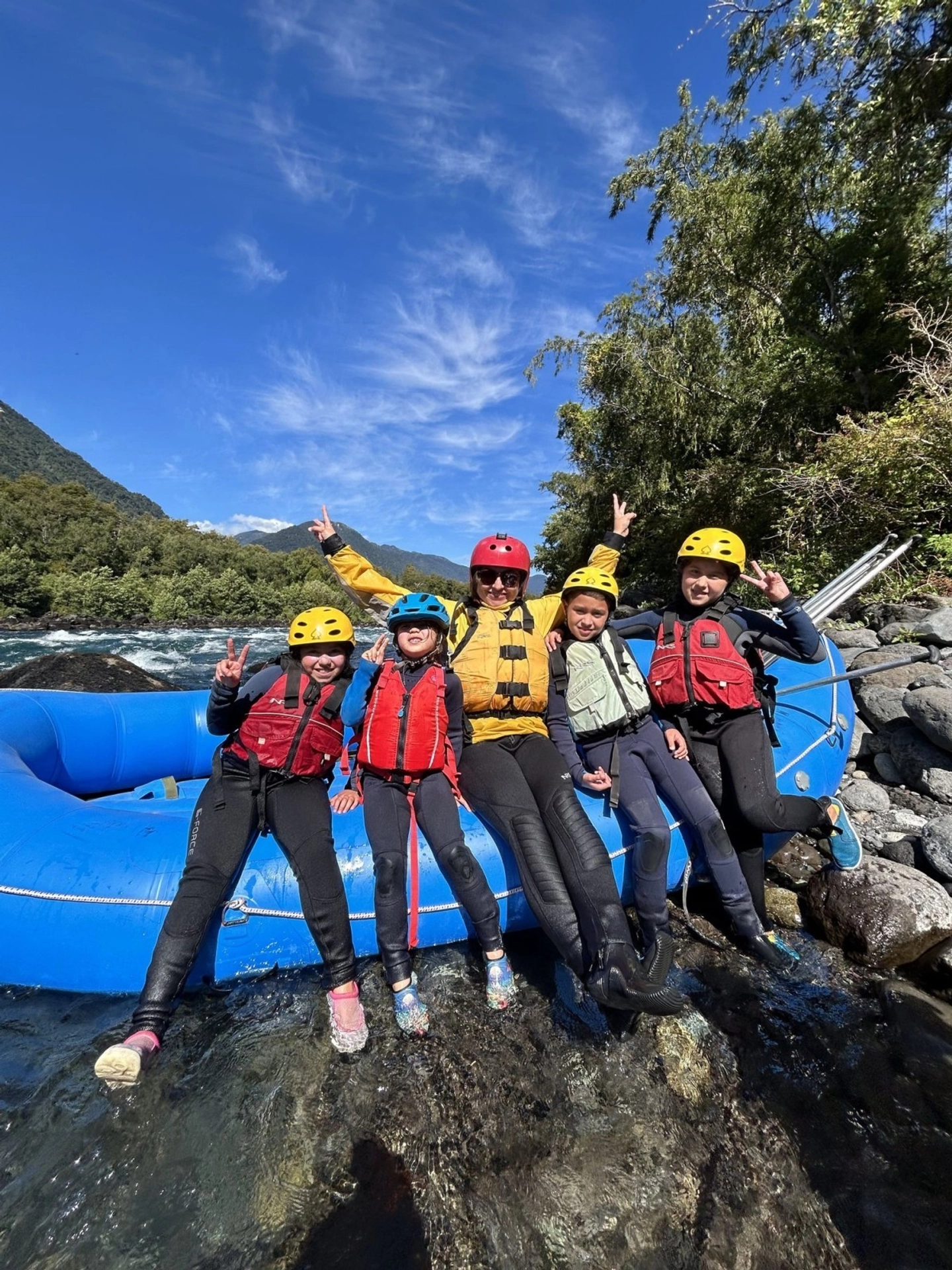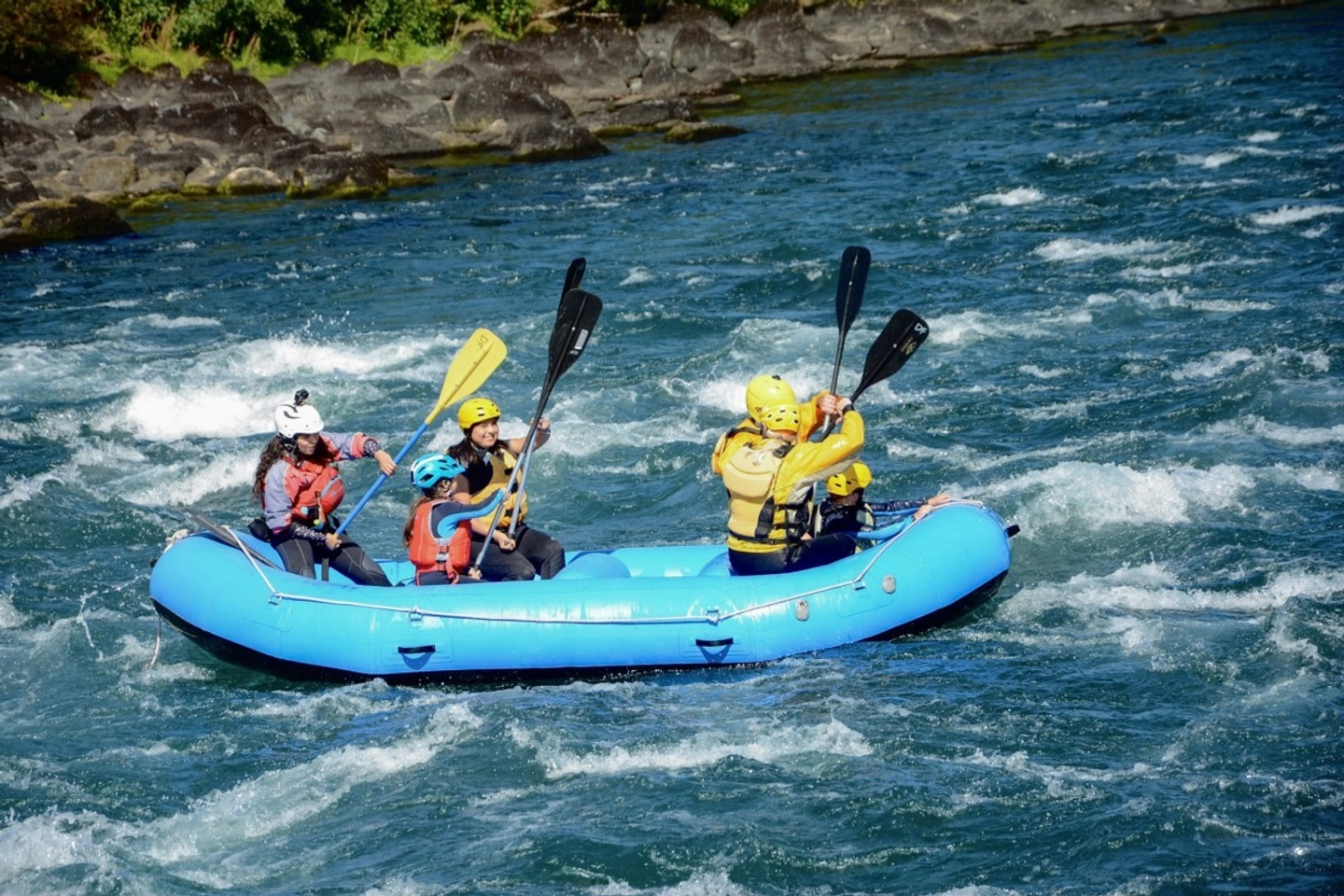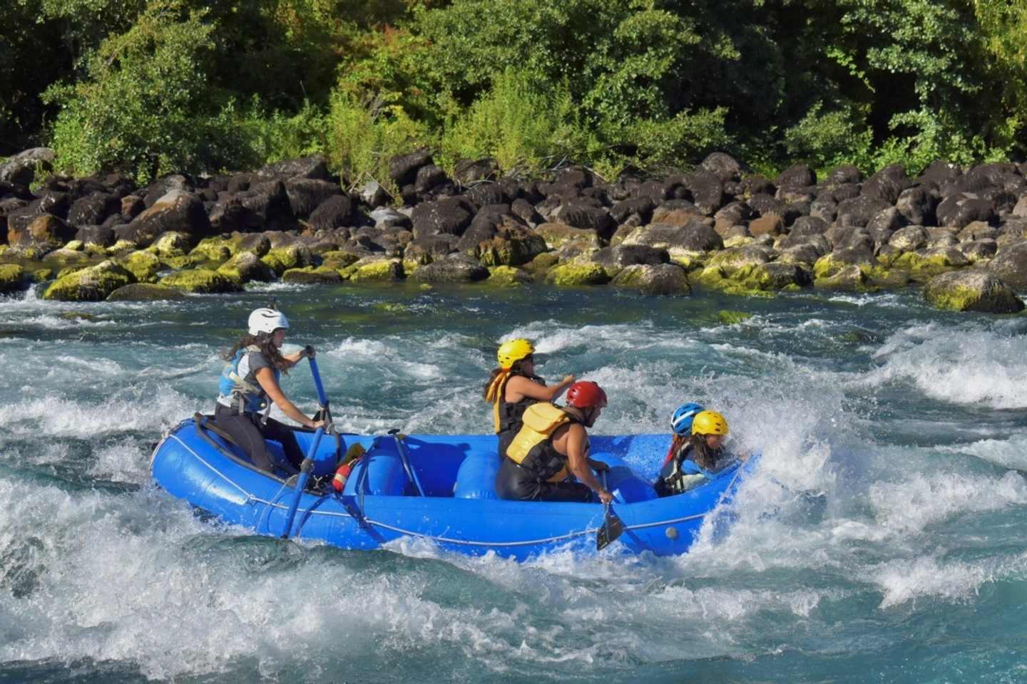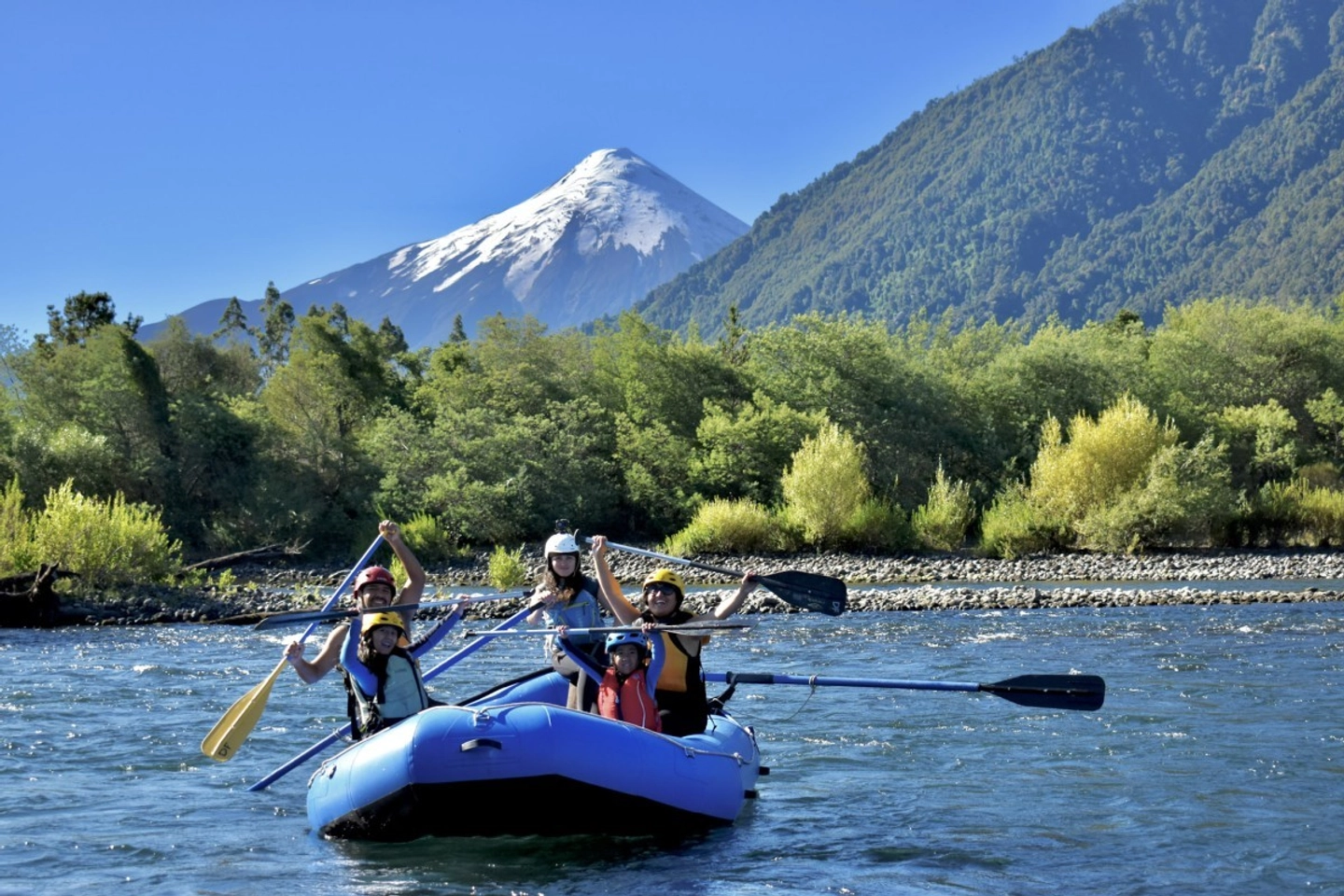 Enjoy a family rafting adventure on the Petrohué River, with class II rapids perfect for children and adults, professional safety and pure fun in nature.