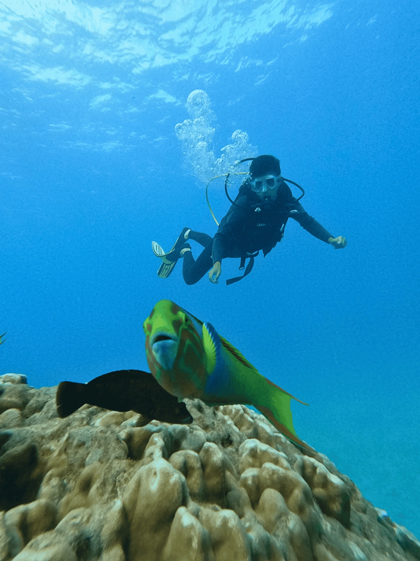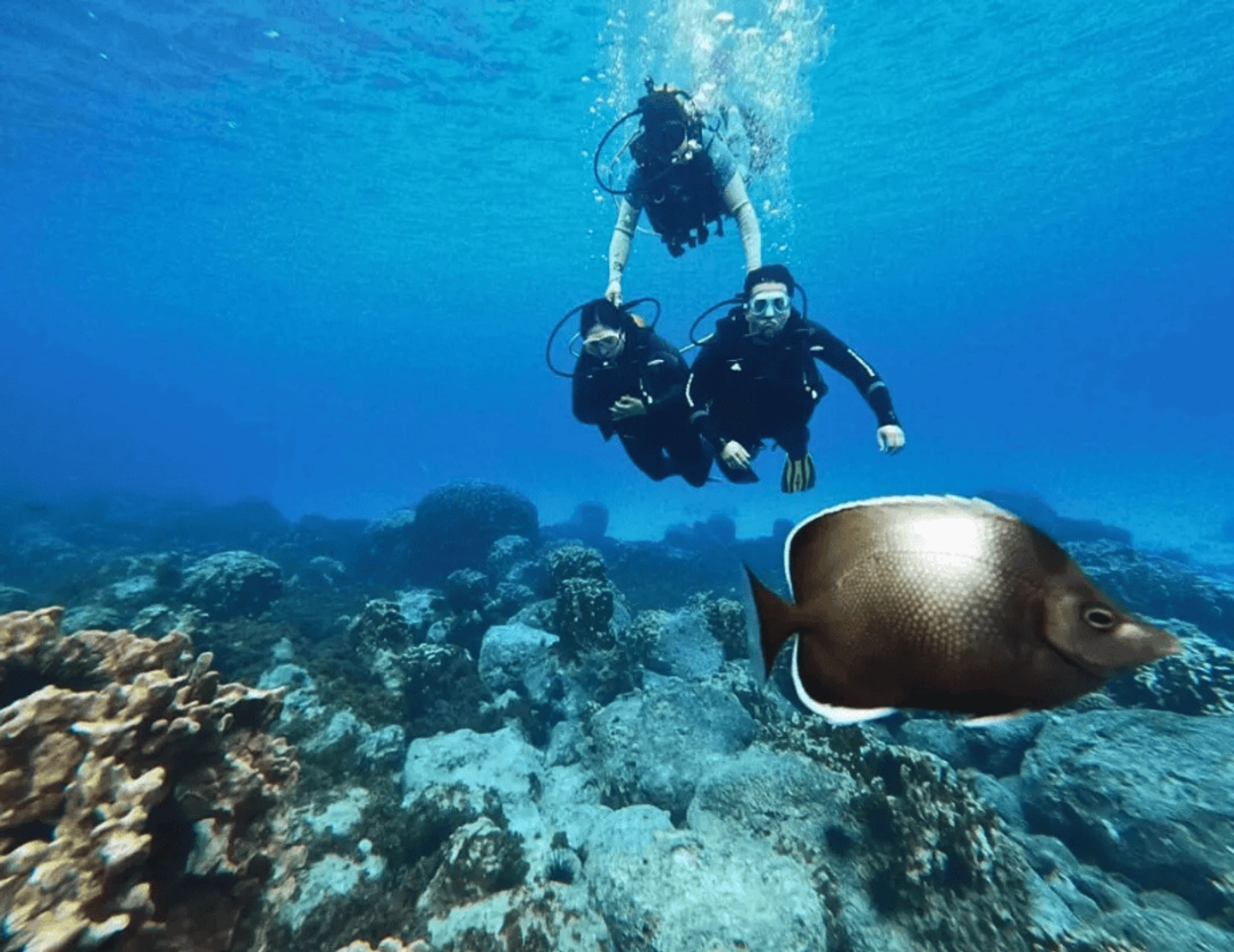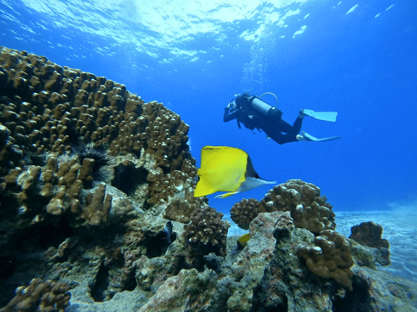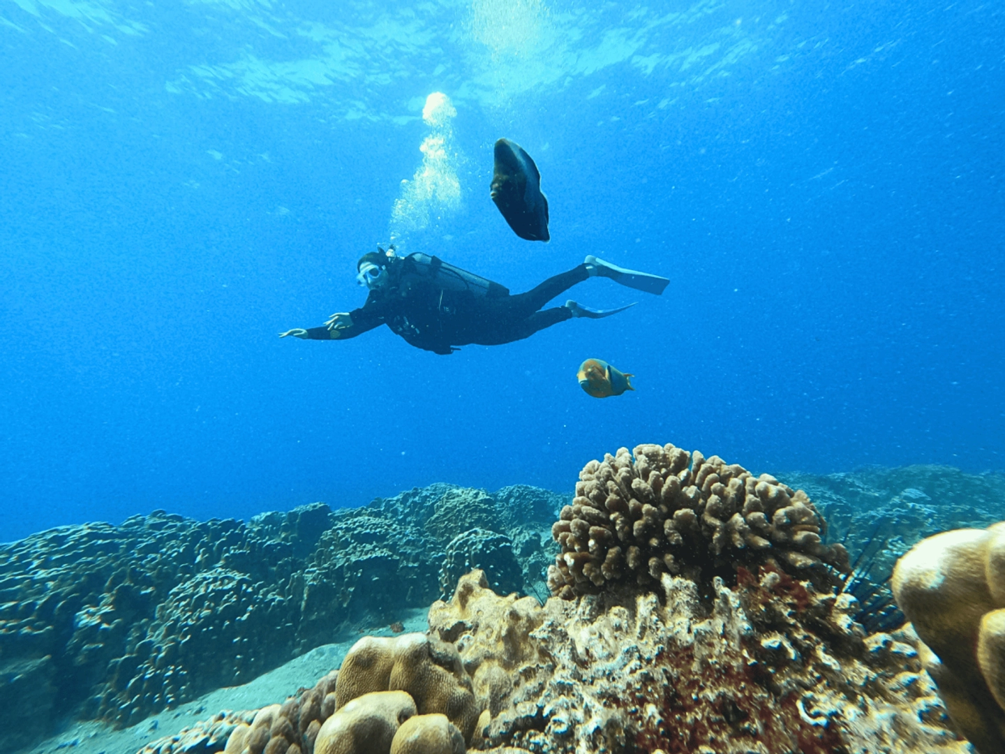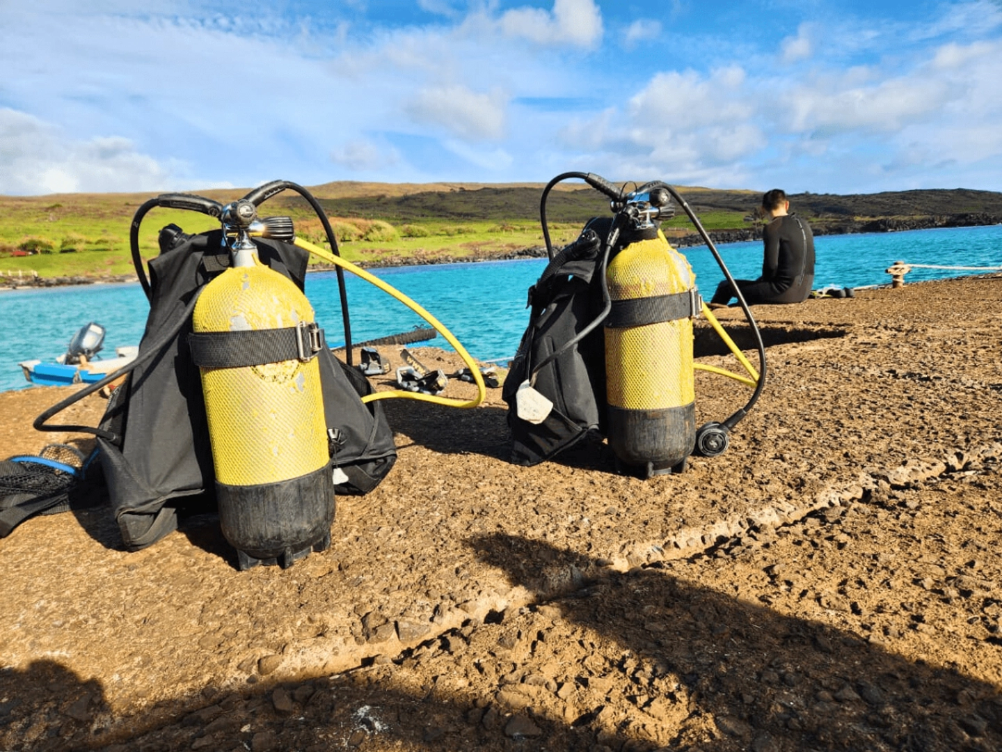 Come and live your first "ruku" or diving experience with us in Rapa Nui, the most remote island in the world! We guide you step by step, from zero, so you can learn how to dive for the first time in a beautiful, crystal-clear sea. Fully assisted by an instructor, you will explore coral reefs, swim among endemic fauna, and be amazed by the sight of "honu" or turtles.