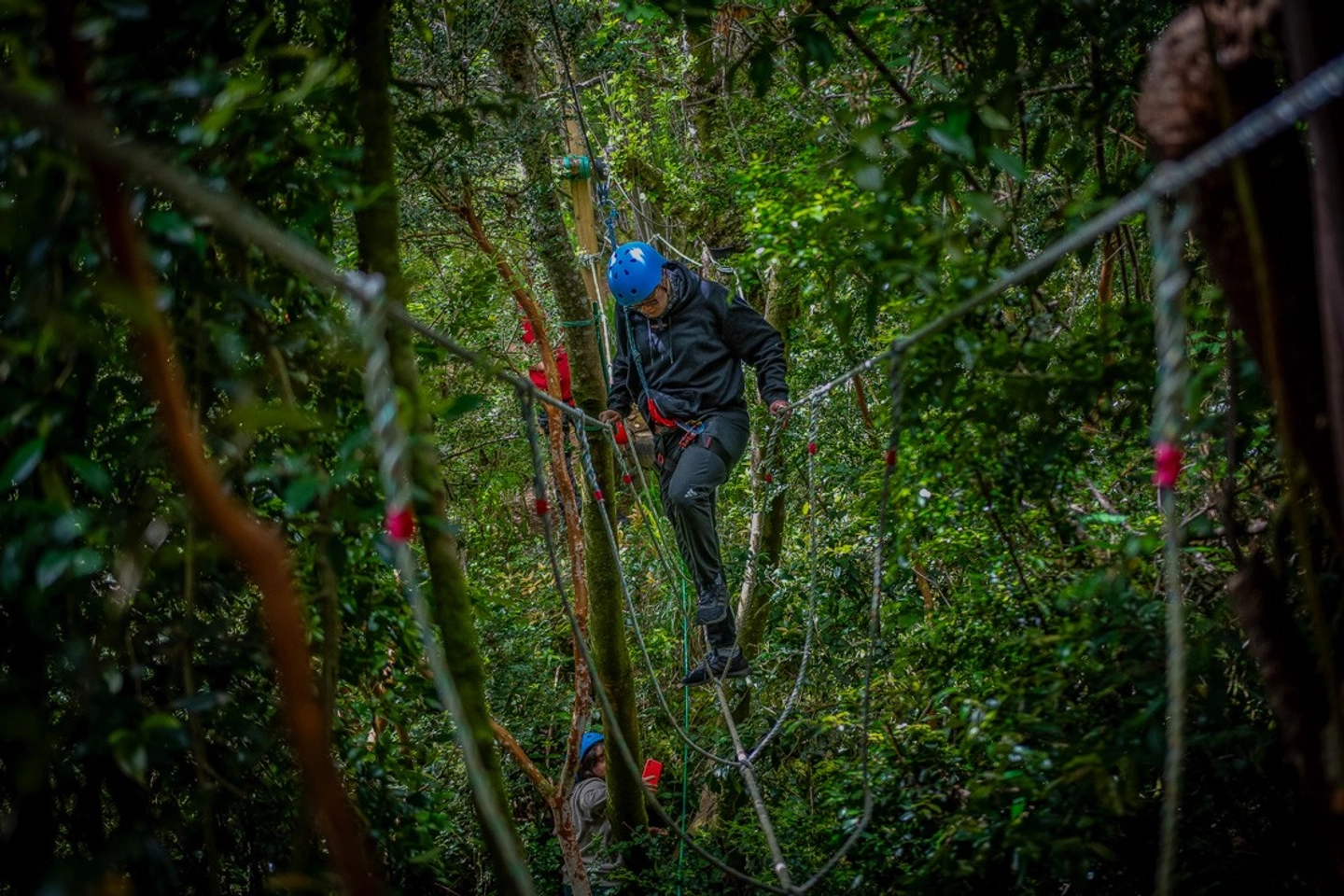 Cruza tres puentes suspendidos, cada uno con niveles de dificultad progresivos, ganando altura en el recorrido.