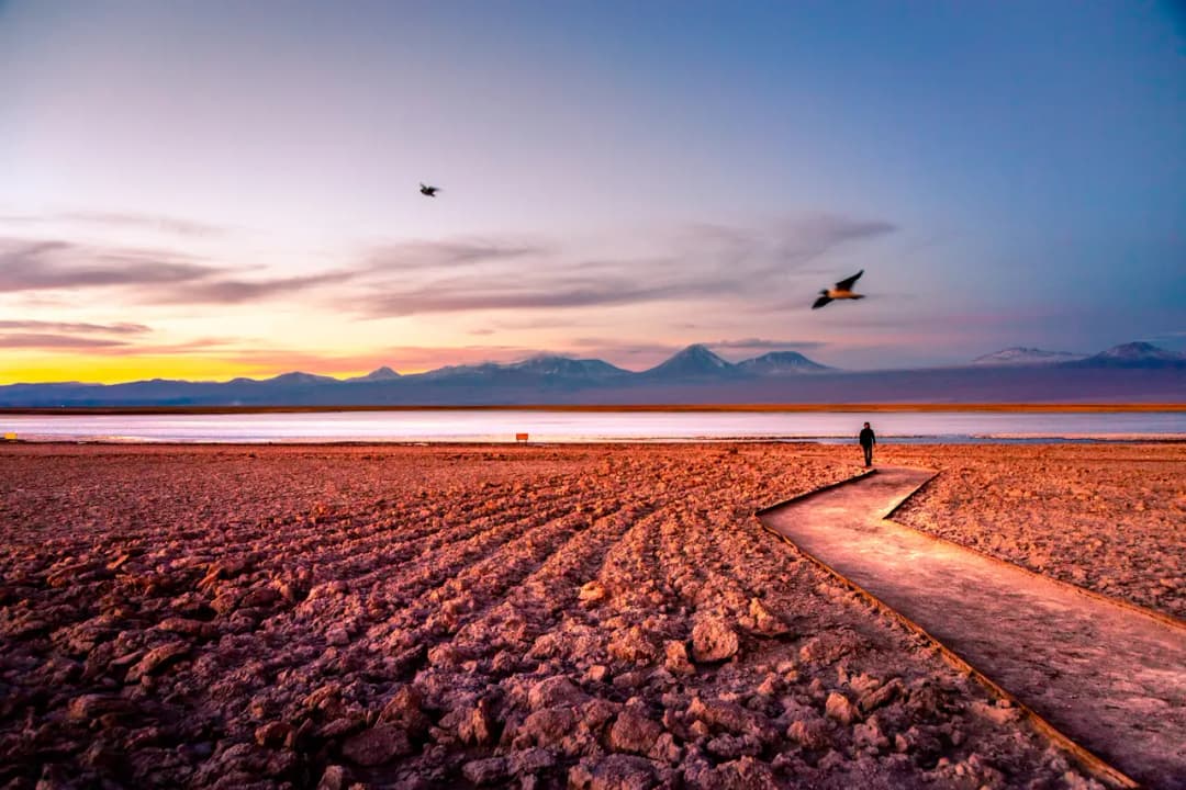 Ubicada en el sector de Soncor, este espejo de agua ofrece un horizonte infinito donde los volcanes se reflejan con nitidez, especialmente durante el atardecer cuando el cielo se tiñe de tonos rosados y ocres.