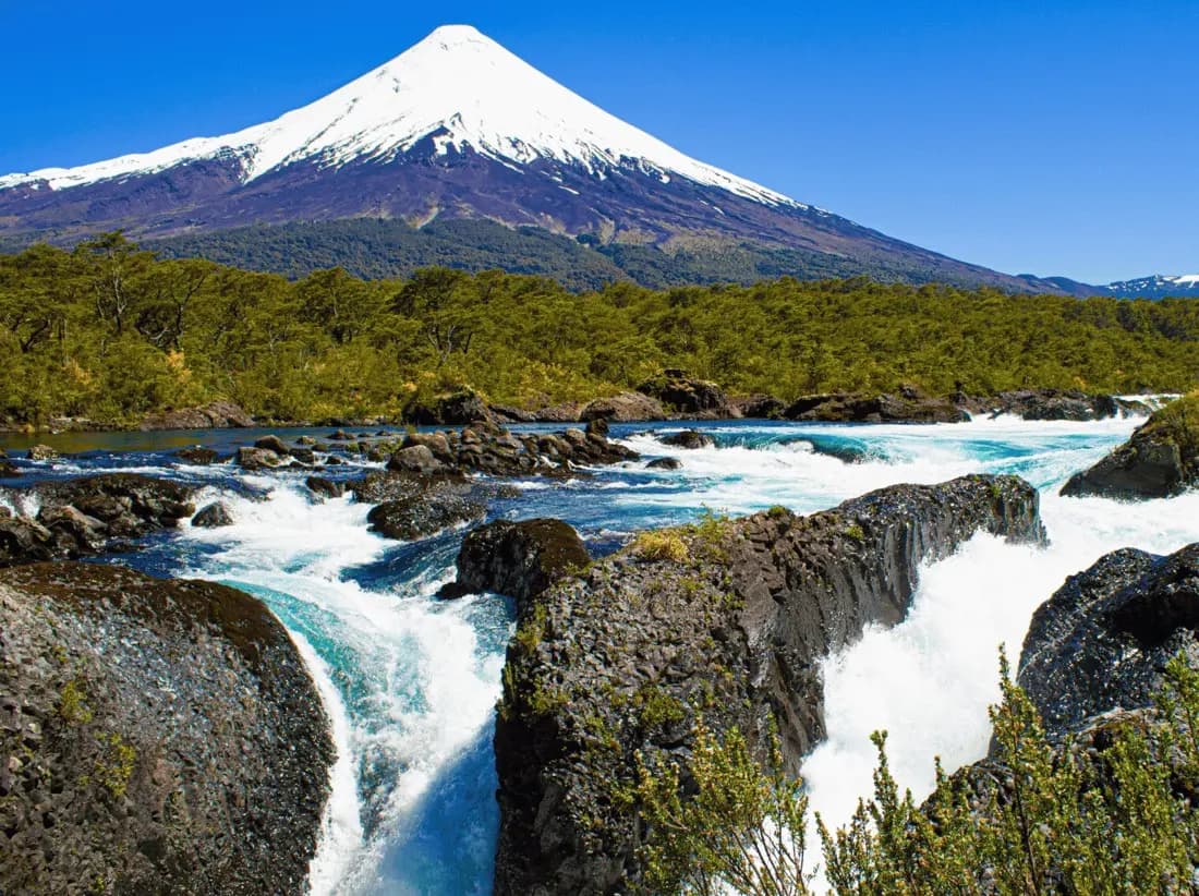 Los Saltos del Petrohué son uno de los paisajes más impresionantes del Parque Nacional Vicente Pérez Rosales . Estas cascadas, formadas por el río Petrohué al descender desde el Lago Todos los Santos , se destacan por el intenso color esmeralda de sus aguas y por el contraste con las rocas volcánicas, marcadas por la silueta del majestuoso Volcán Osorno .