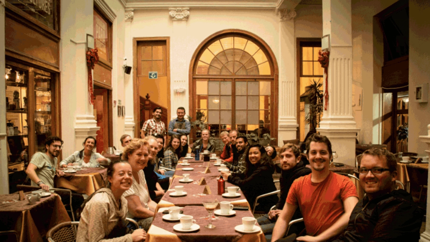 Reunión del grupo en el punto de inicio para comenzar la caminata gastronómica por el centro de Bogotá.