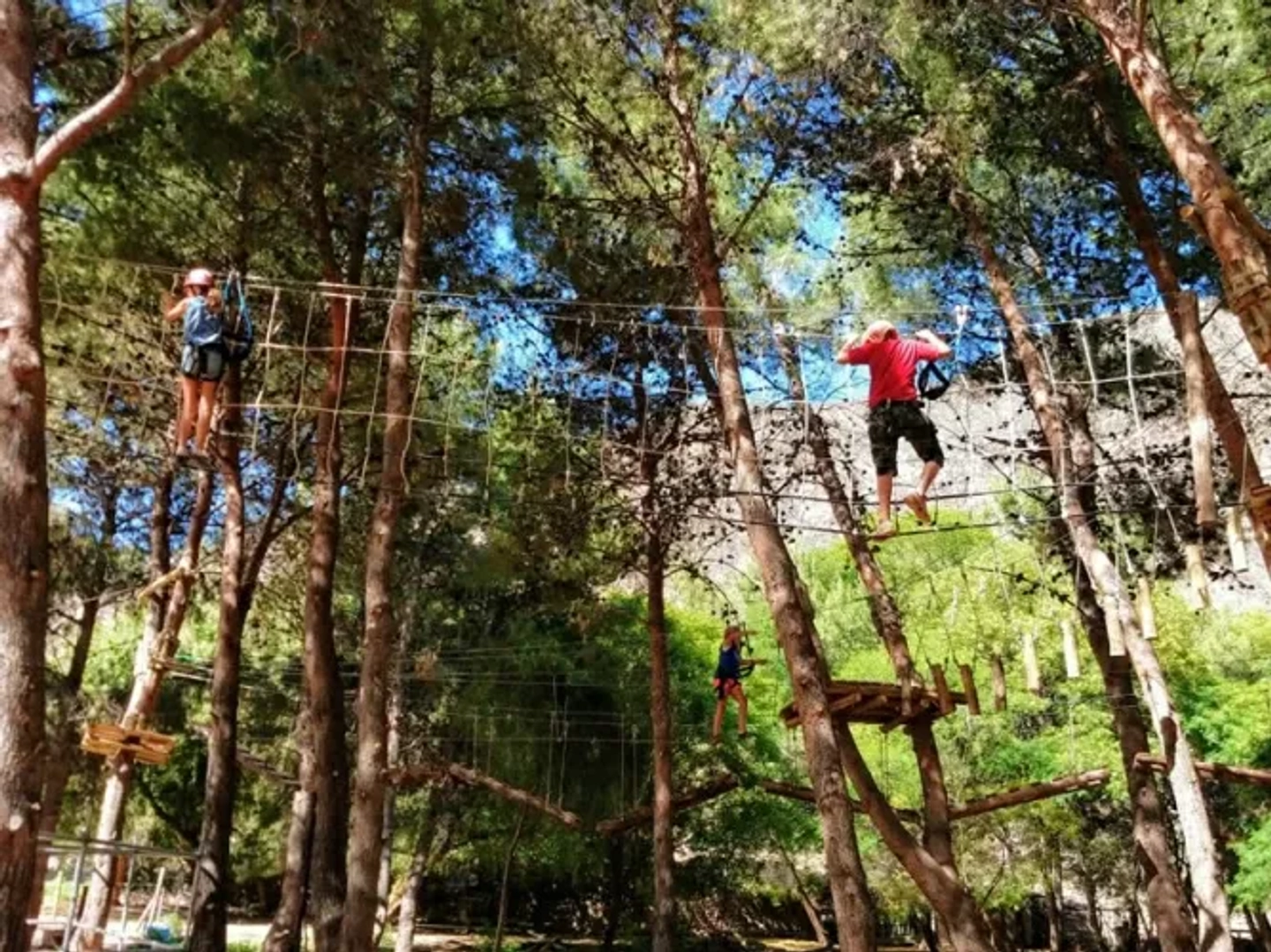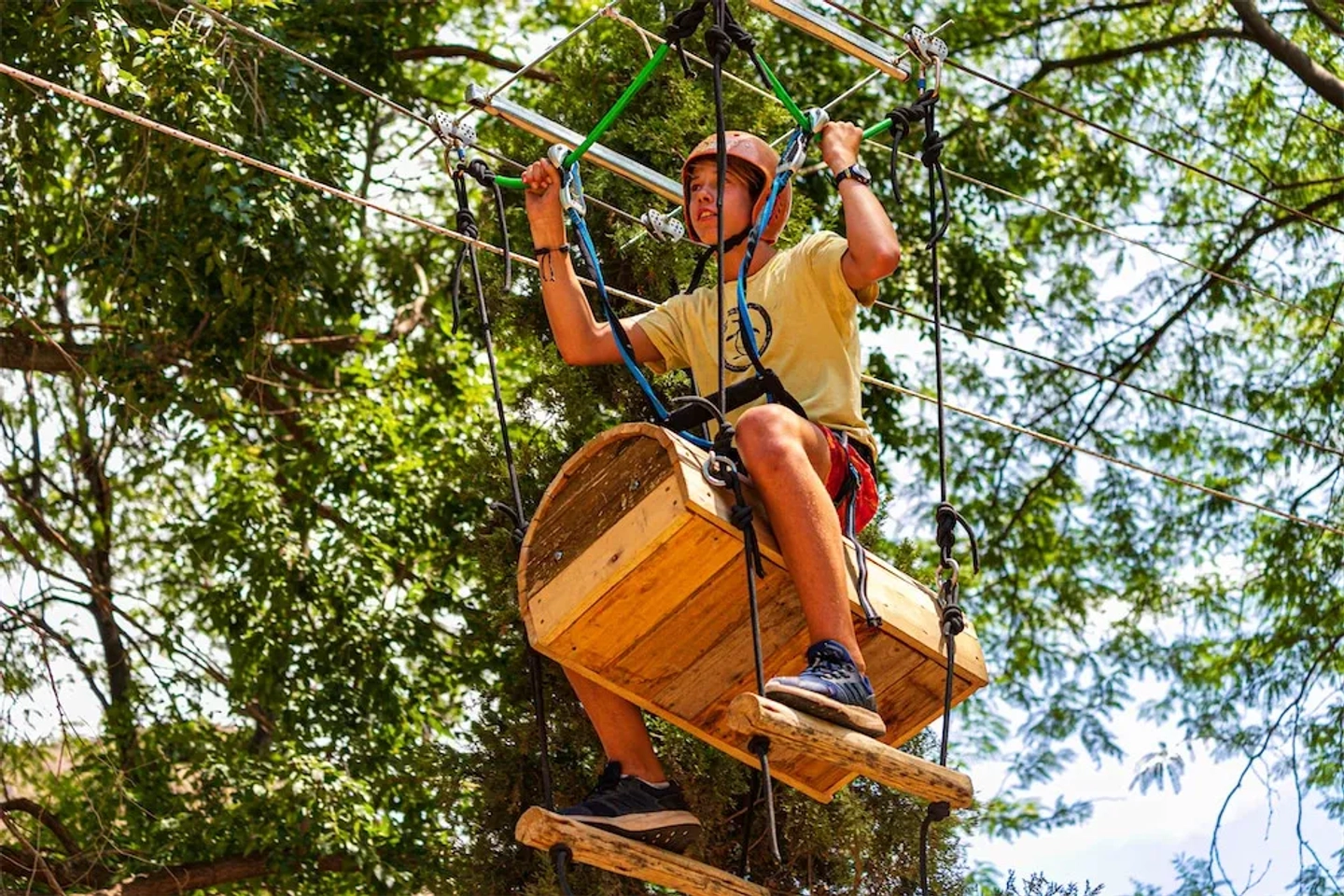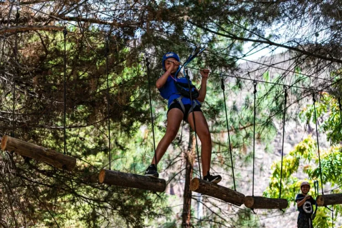Una vez listo, te enfrentarás al desafío principal: un recorrido aéreo de 200 metros compuesto por 14 emocionantes juegos. Pondrás a prueba tu equilibrio y coraje cruzando puentes tibetanos, deslizarás tu adrenalina en veloces tirolesas y navegarás a través de túneles colgantes, todo mientras disfrutas de una perspectiva única del bosque, siempre asegurado a la línea de vida.