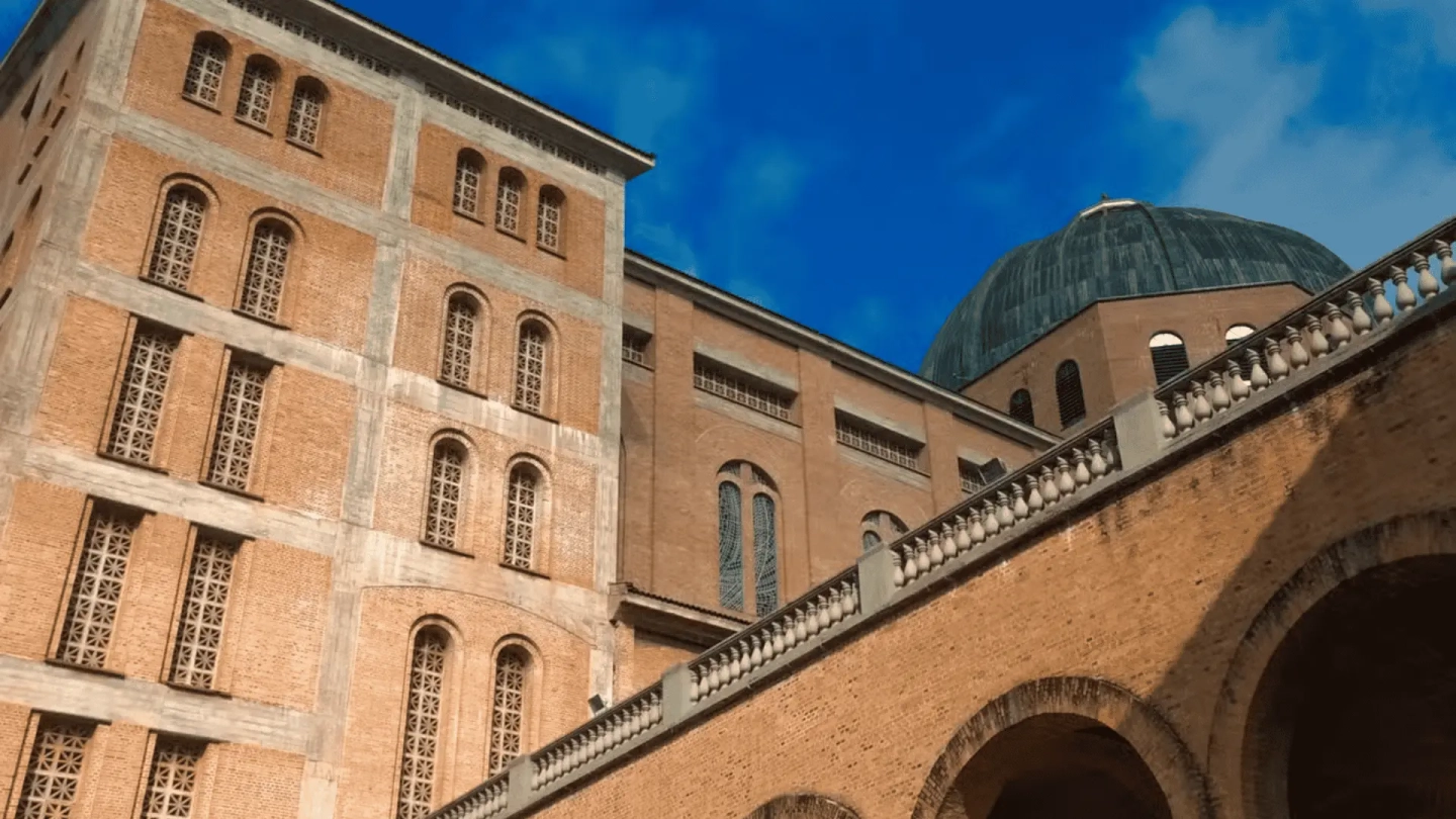 Observación de la arquitectura de la Basílica de Nuestra Señora de Aparecida y explicación sobre su relevancia y dimensiones.