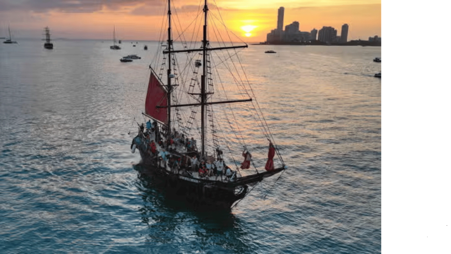 Tour en barco pirata por la bahía con música a bordo y un ambiente relajado para disfrutar del atardecer.