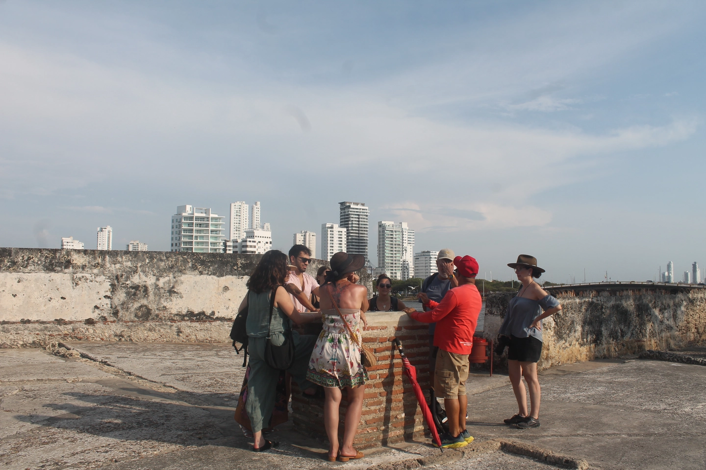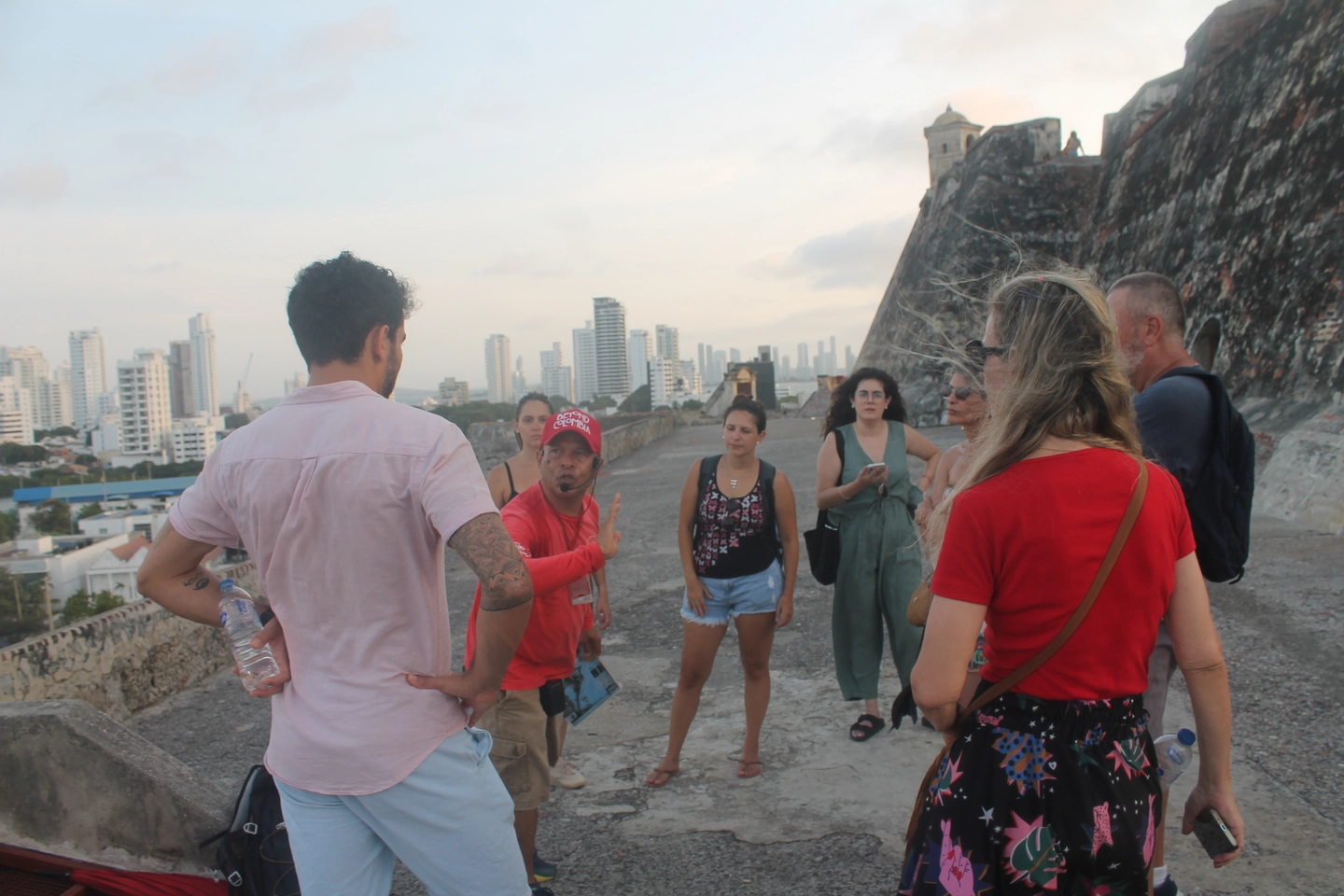 Caminamos por los diferentes niveles del castillo mientras el guía relata ataques, estrategias militares y la importancia del lugar en la defensa de Cartagena y del comercio en el Caribe.
