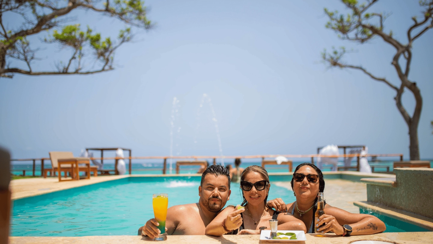 Tiempo en un club de playa con bebida de bienvenida para continuar la jornada en un ambiente festivo.