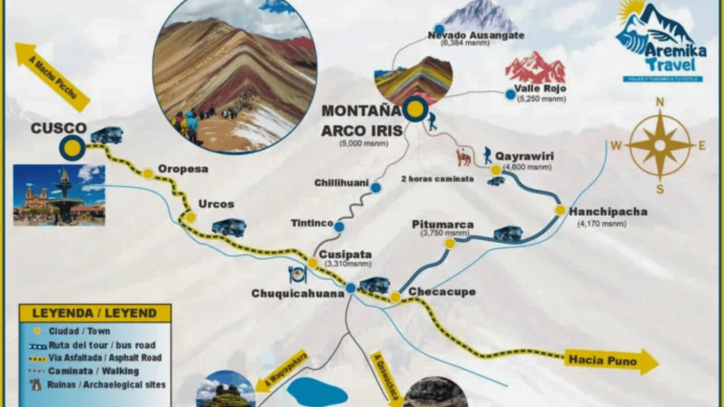 La jornada comienza temprano con la recogida en tu alojamiento en Cusco para iniciar el recorrido hacia la zona de Vinicunca.