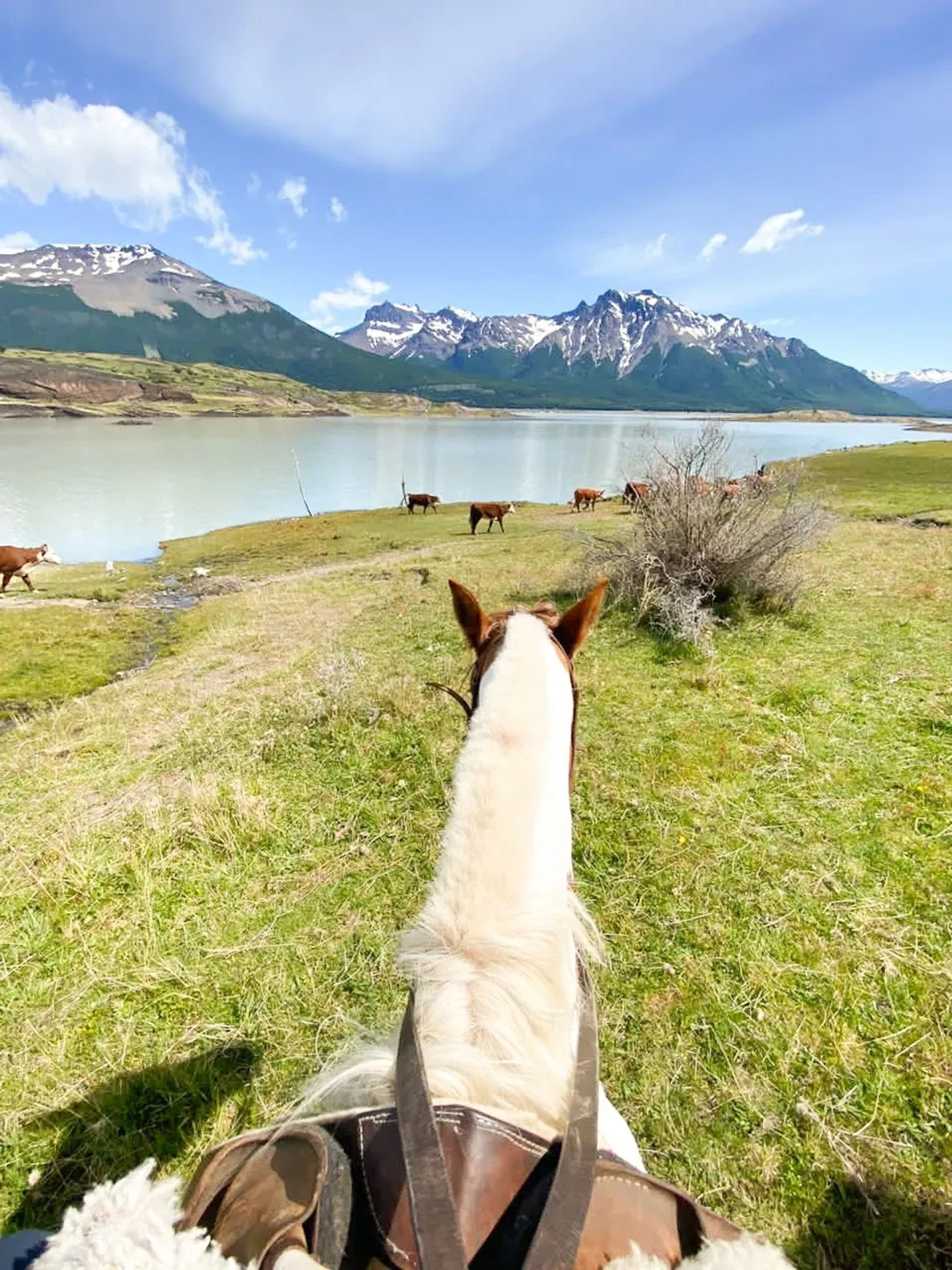 En caso de seleccionar la cabalgata de 1 hora, irán acompañados de un guía experto que los hará recorrer a caballo los alrededores de la estancia teniendo impresionantes vistas del Brazo Sur del Lago Argentino Recorreremos senderos que nos llevarán a un bosque de lengas y ñires, hogar de caranchos, águilas, liebres, pájaros carpinteros y una rica fauna y flora autóctona.