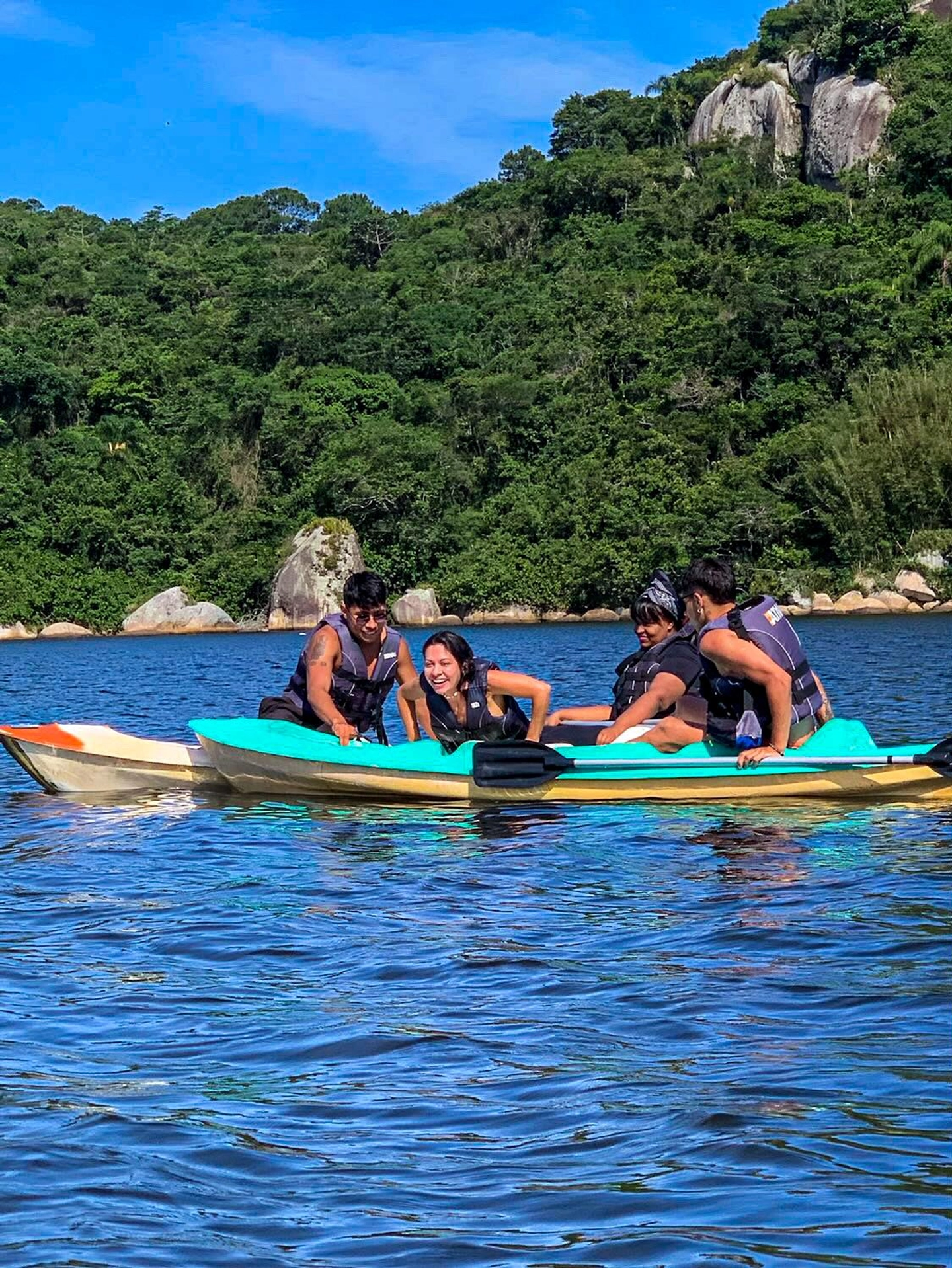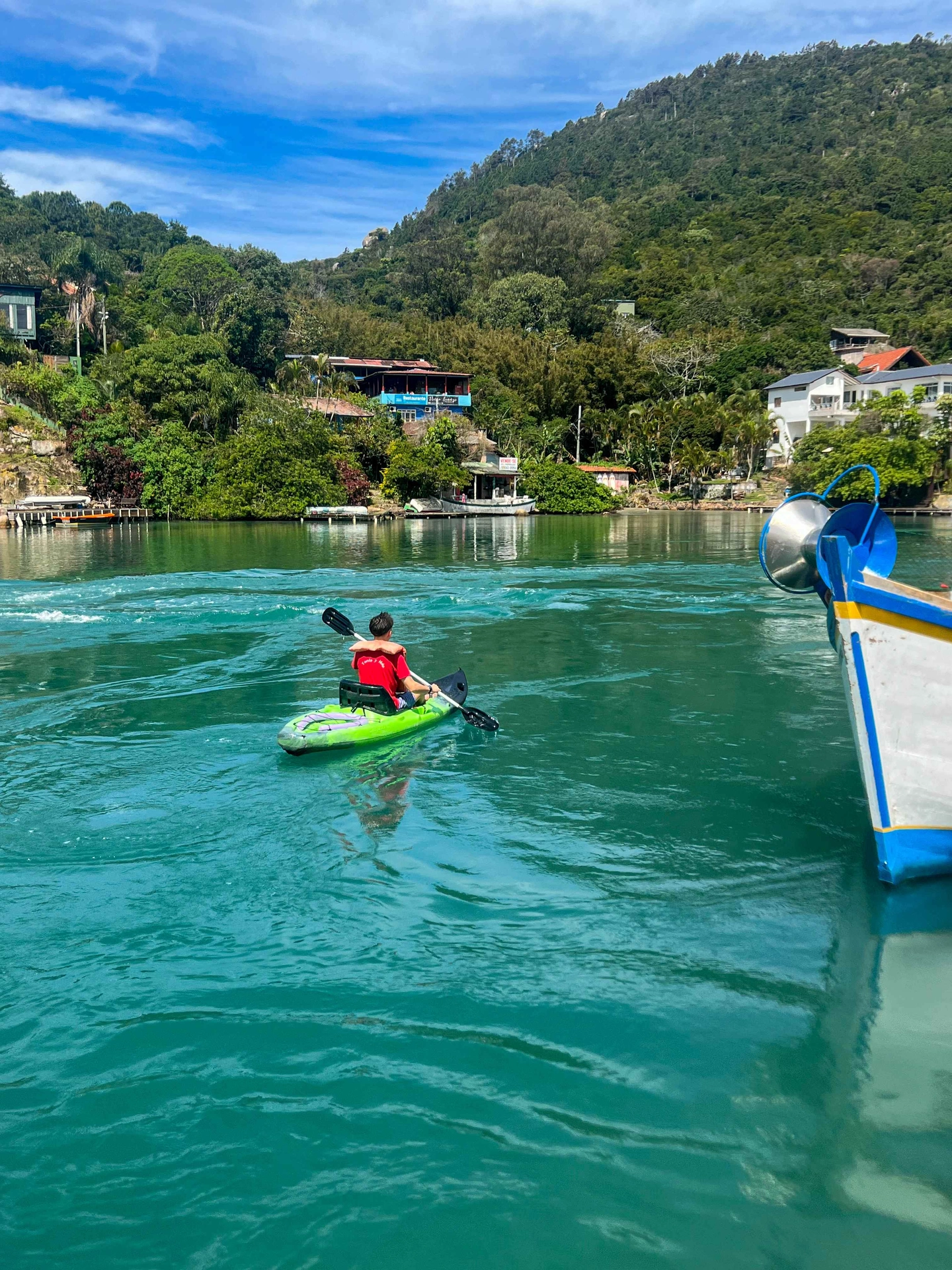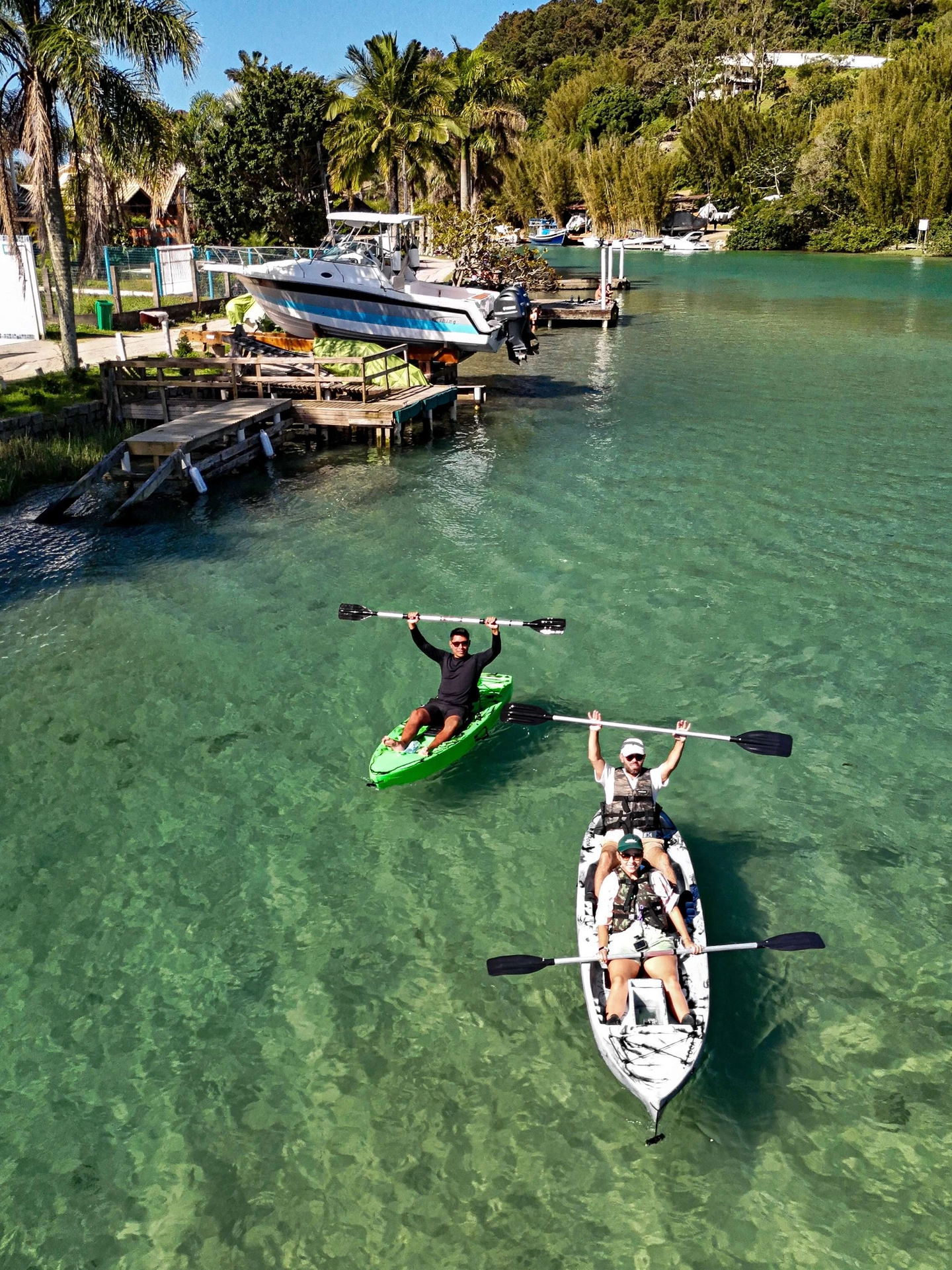 Retorno en kayak hacia la zona de inicio, finalizando la experiencia en la Ponte Pênsil de Barra da Lagoa.