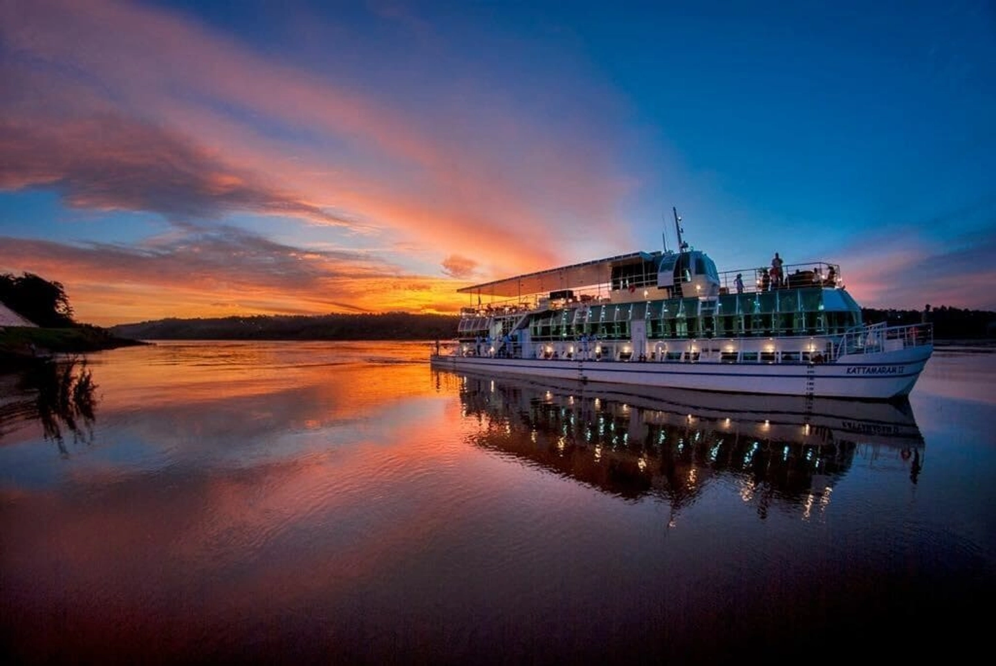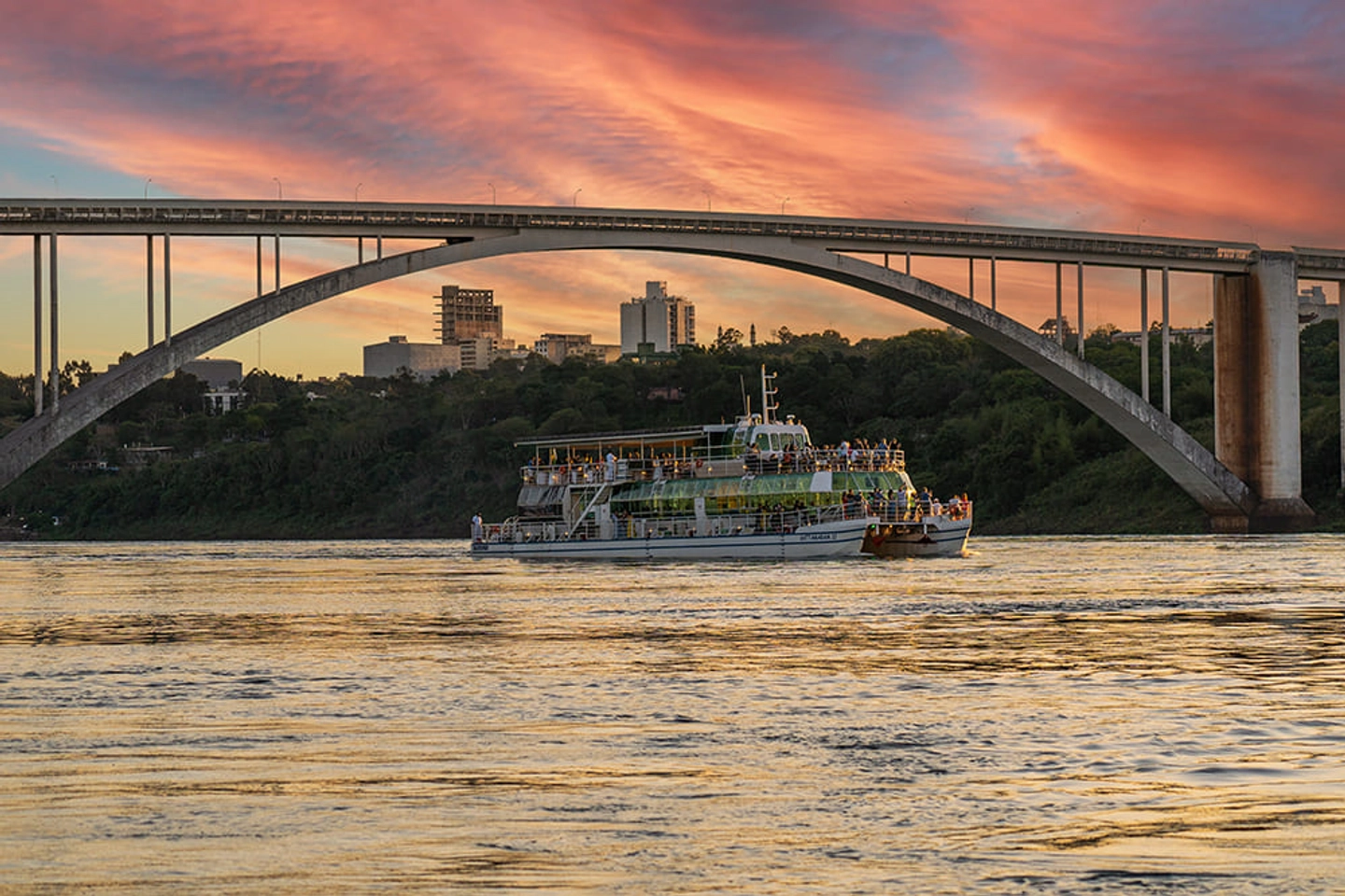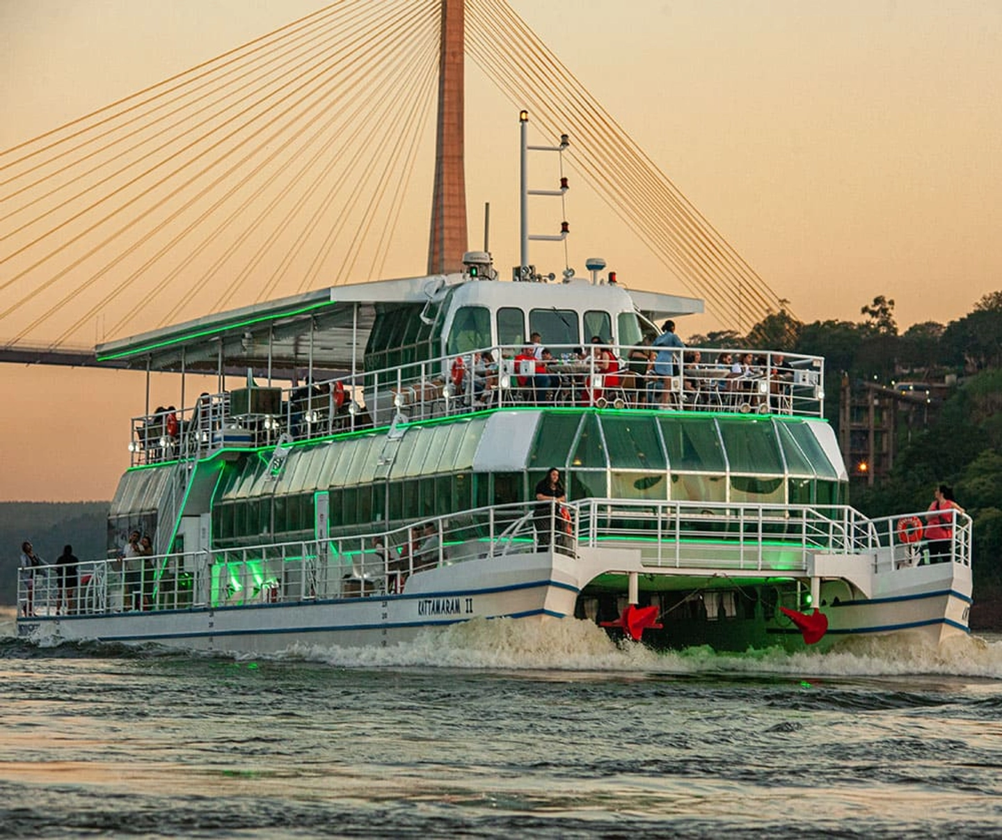 Disfruta un tour en catamarán con cena por el río Paraná, traslados desde hoteles en Foz do Iguaçu, vistas panorámicas de la Triple Frontera y un entorno ideal para contemplar el atardecer.
