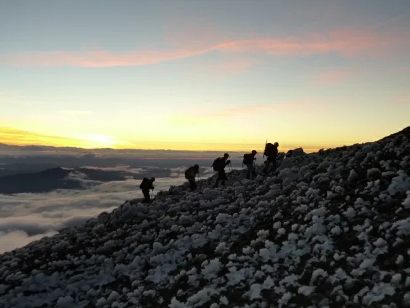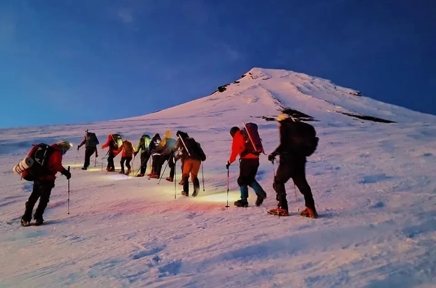 Si el clima y el estado físico lo permiten, durante la madrugada intentamos partir hacia la cumbre siguiendo los faldeos de la ladera Norte. Antes habrá una charla para explicar cómo se usan los grampones y la piqueta, ya que las condiciones de la nieve son muy duras por la mañana. Esta charla se dará donde comience la nieve, lugar que puede variar según la época del año. Usaremos las linternas frontales para iluminar nuestro camino. Vamos ascendiendo por la pendiente nevada y luego de unas 3 horas llegamos al “Plató de los 3.000 msnm”. De allí nos dirigiremos hacia la Canaleta del Silencio, que dibuja en la cara norte del volcán una línea directa que nos llevará hacia la cumbre. A esta altura del día, el sol estará mostrando sus rayos en el horizonte. La vista es inmejorable. Este segundo día serás testigo de imágenes que jamás olvidarás: lagos, montañas, estepa y bosques, todo al alcance de tus ojos. Cuando estemos en la cumbre, nos sacamos fotos y disfrutamos de la naturaleza, de estar en contacto con ella. Todo a nuestro alrededor es mágico. No te olvides de traer la cámara cargada y con mucha memoria, pero más importante aún: acordate de disfrutar, de estar presente en el momento, de observar todo lo que te rodea. Luego emprendemos el descenso tranquilo hacia el refugio. Una vez allí, nos hidratamos y almorzamos. Preparamos nuestra mochila y comenzamos el descenso hacia la base del volcán, donde emperenderemos el regreso a Junín de los Andes y luego a San Martín de los Andes.segundo día es más exigente. Dependiendo de factores como el clima y el estado físico del grupo se fija la hora exacta, alrededor las 4 de la mañana se sale para llegar a la cumbre si o si antes del mediodía. Una vez arriba y disfrutando lo que el clima permita de la cumbre, empezamos el descenso hasta el refugio. Descansamos un rato, armamos las mochilas y seguimos rumbo a la base, donde los esperamos con una picada de festejo. Dependiendo del ritmo que hayamos llevado, podemos estar listos para subirnos a las camionetas a partir de las 19 hs aprox imadamente .