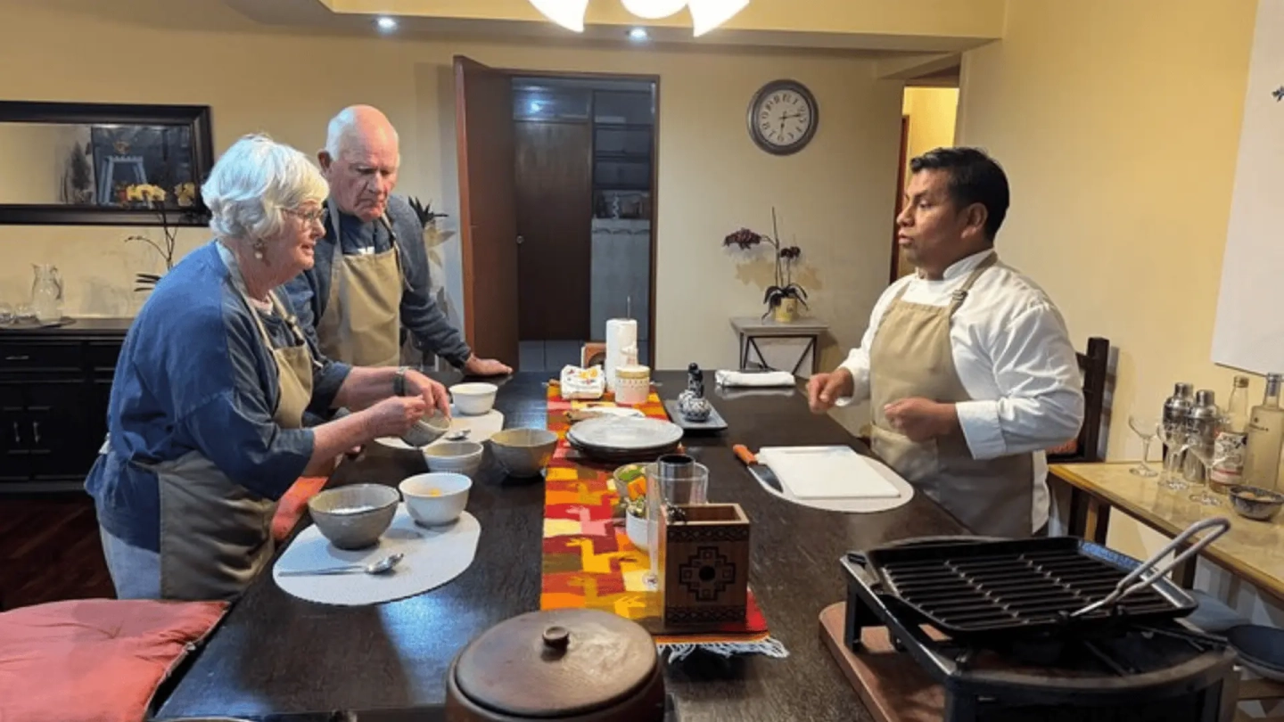 Recepción en la cocina privada para conocer la dinámica de la experiencia y comenzar la preparación de recetas peruanas junto al chef.
