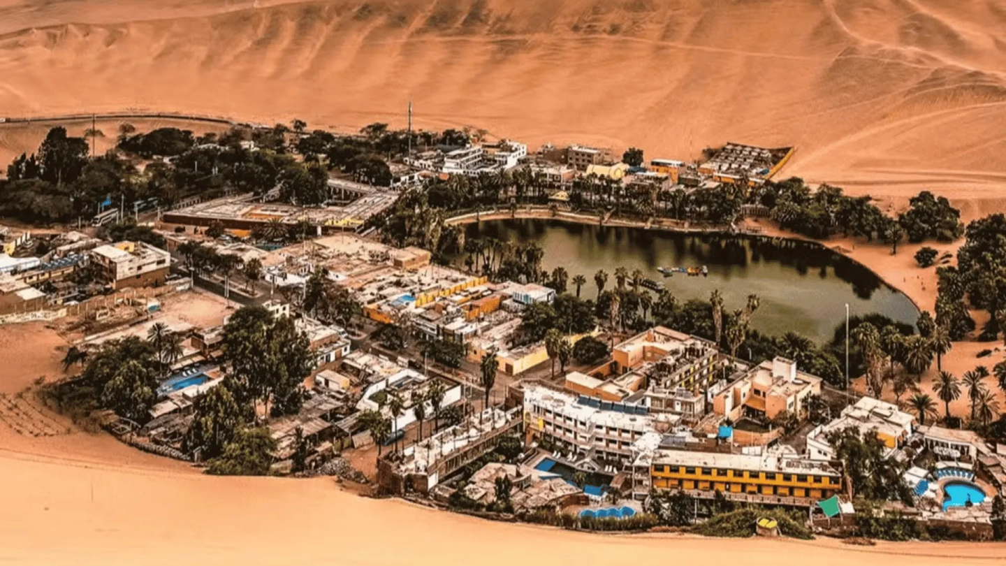 Viaje terrestre hacia el oasis de Huacachina con información sobre el entorno y la historia local durante el trayecto.