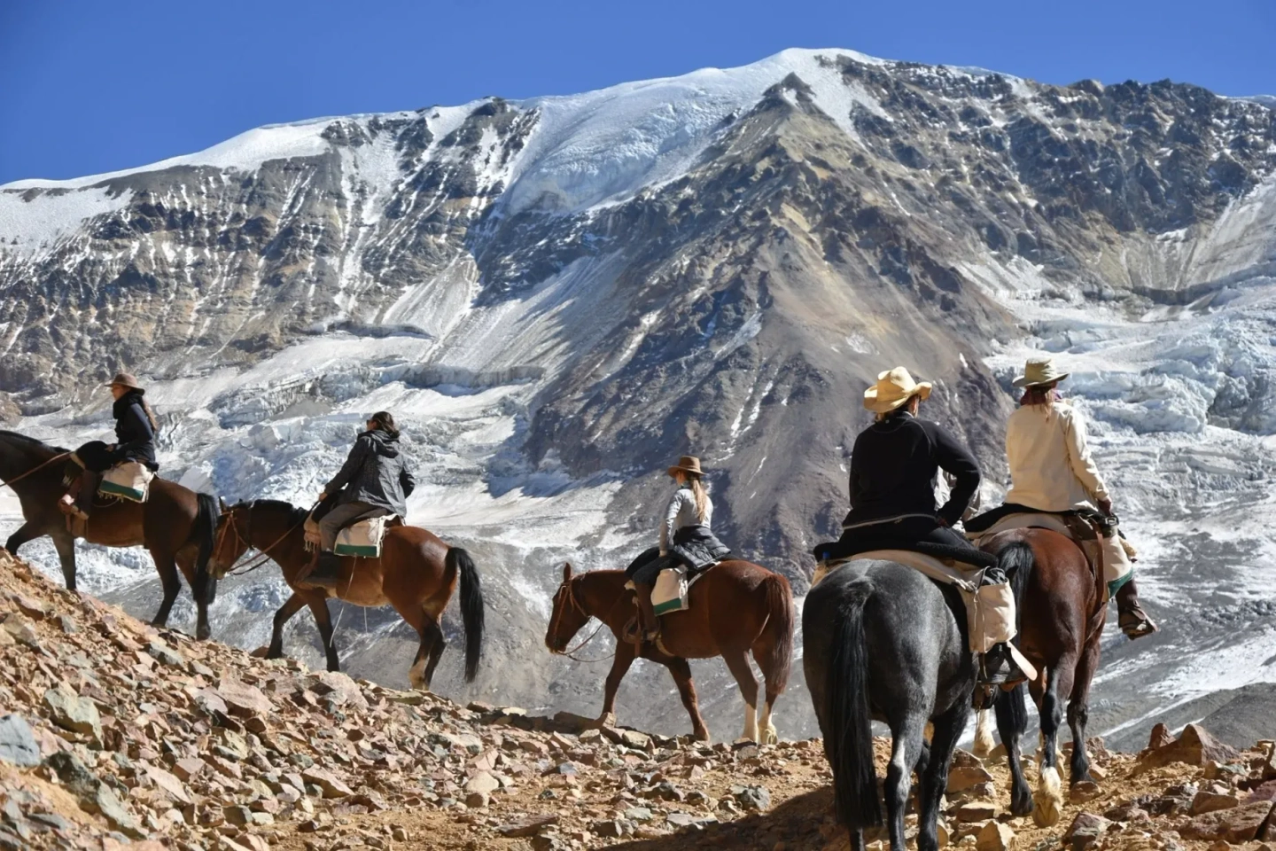3 Desayuno y partida. Por la mañana se llega al nacimiento del arrollo las Lagrimas, la jornada de este día será la más dura ya que tras cuatro horas de cabalgata en asenso, alcanzamos los 3.700 msnm arribando al sitio donde se encuentran los restos del avión en el Glaciar de las Lagrimas. Rendiremos en silencio nuestro homenaje a las víctimas, para luego hacer un reconocimiento del lugar. Almuerzo. Descenso hasta el campamento Base. Cena y pernocte.