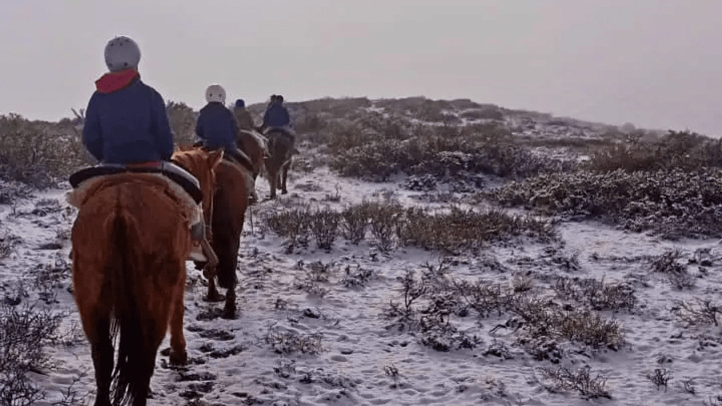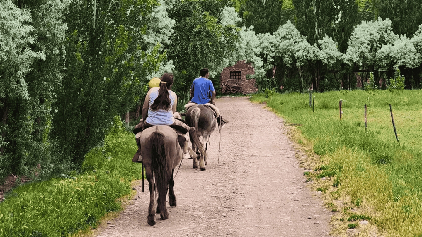 La cabalgata al atardecer en la Colonia Pehuenche es una experiencia sensorial y comunitaria diseñada para conectar con la pausa del campo mendocino mediante un sistema de monta adaptado y seguro.