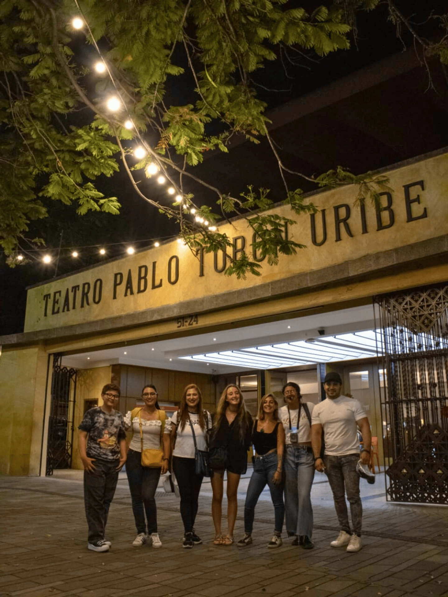 Encuentro en la entrada principal del Teatro Pablo Tobón Uribe, identificando al guía con la sombrilla azul.