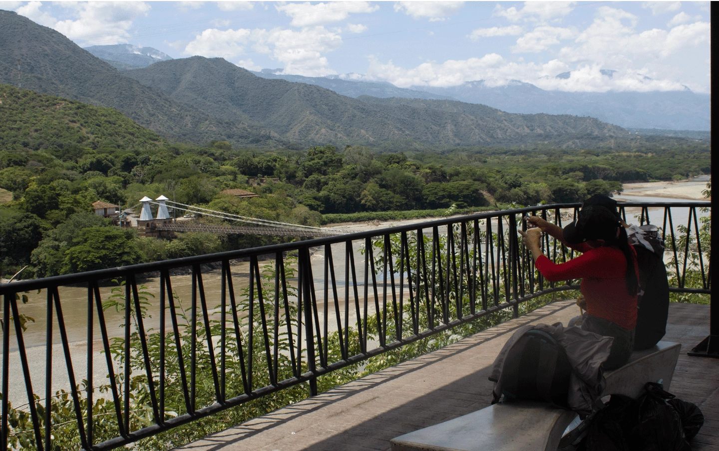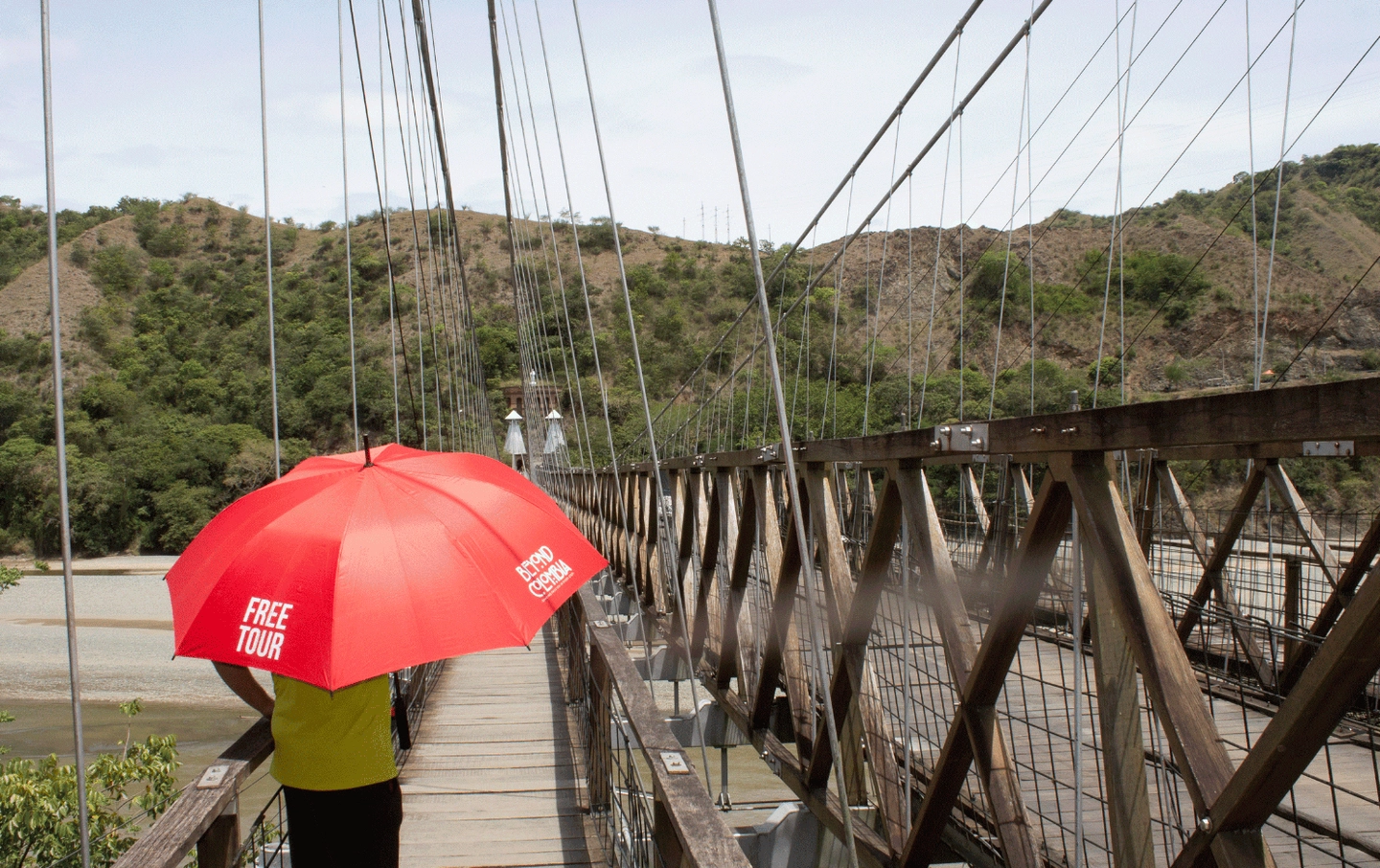 Cruza el histórico Puente de Occidente, una joya de la ingeniería sobre el río Cauca.