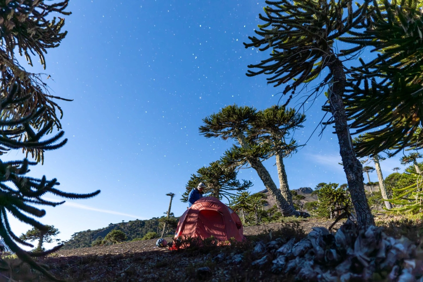 3 HorasEstablece el campamento a 1.600 msnm, entre bosques de Araucarias y arenales volcánicos.