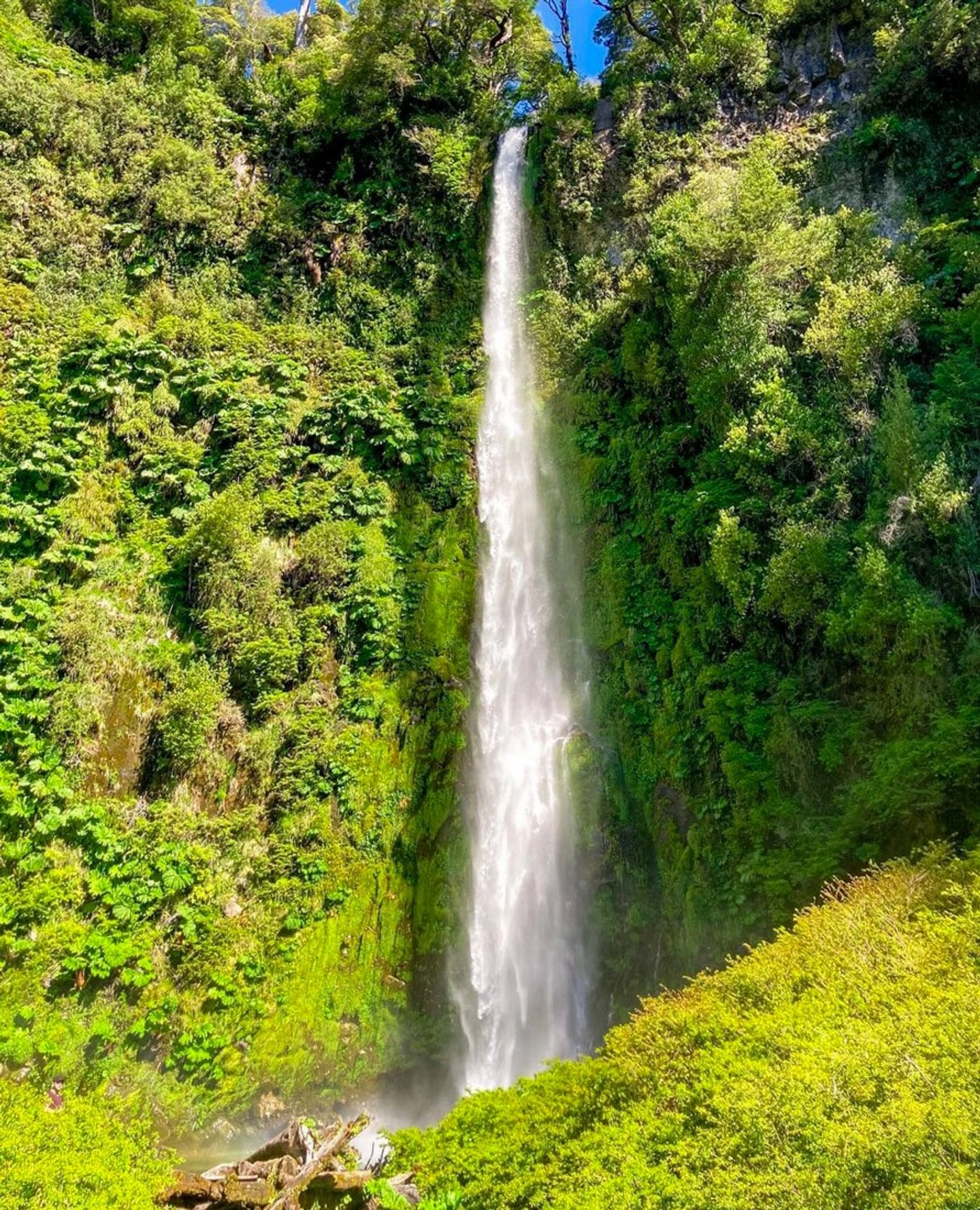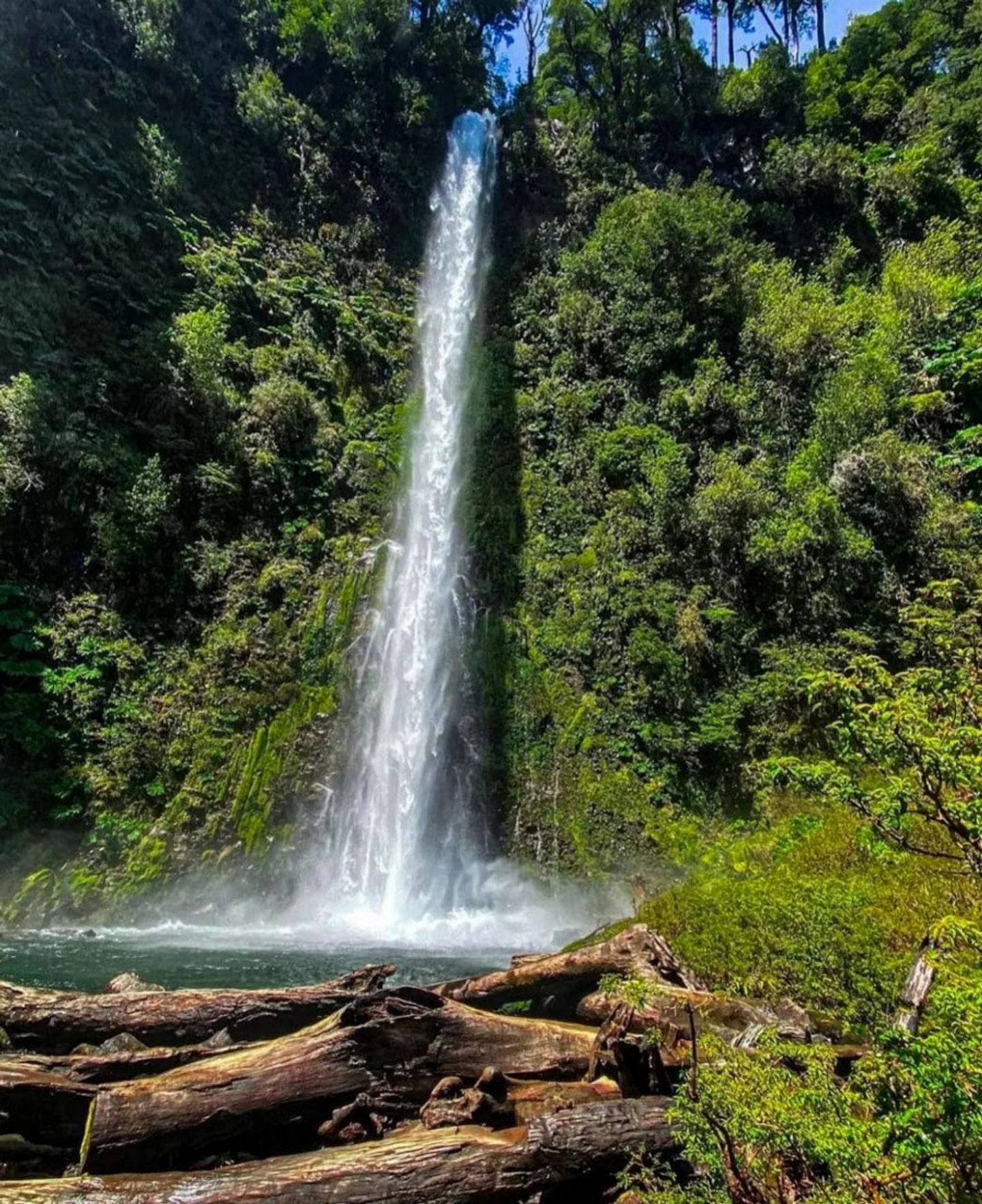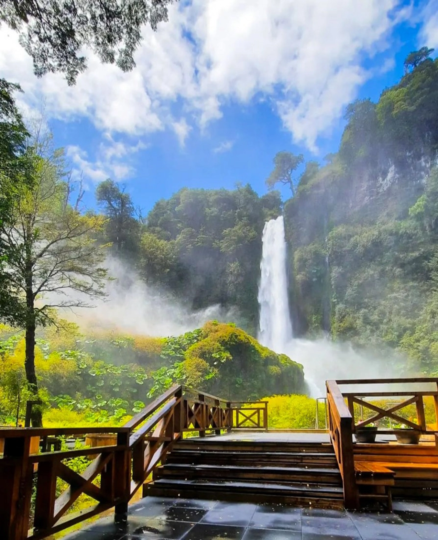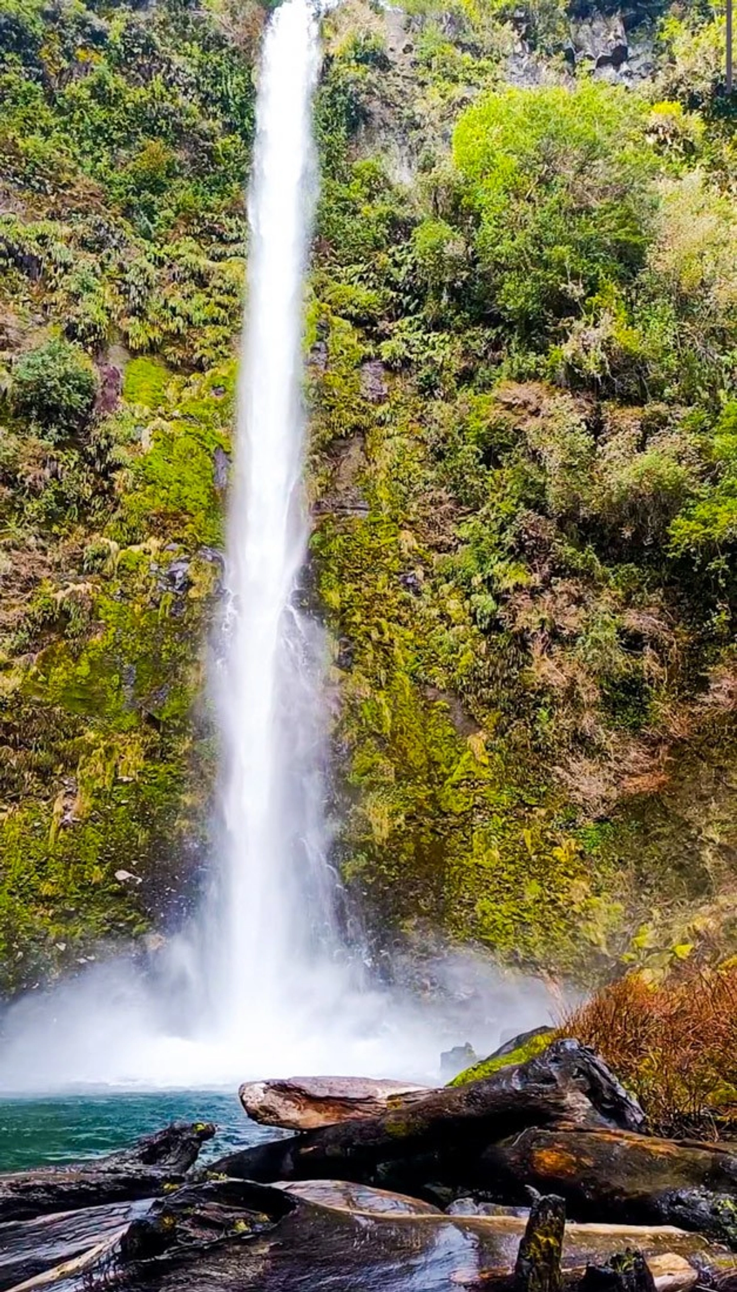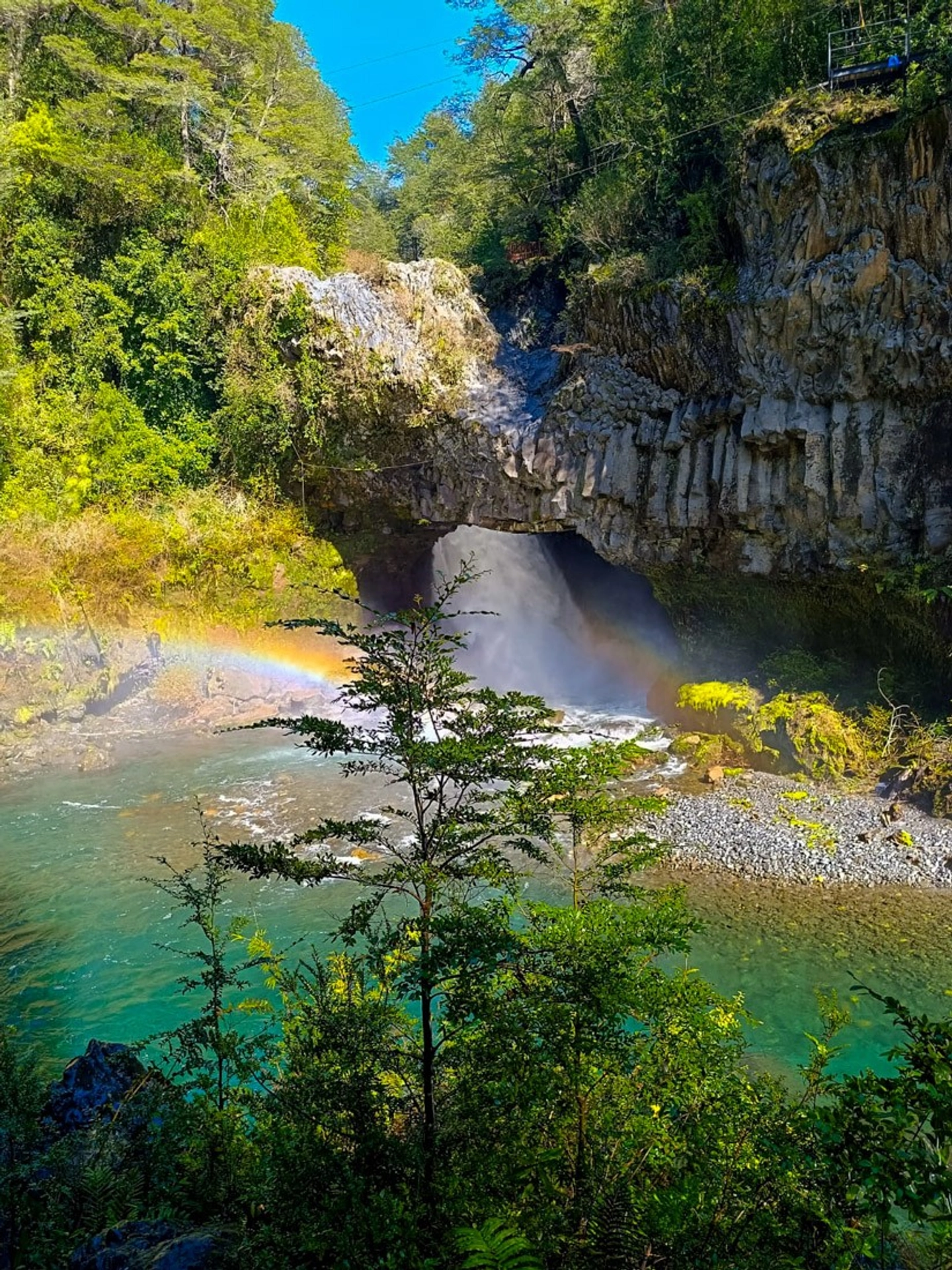 Cascada de más de 90 metros rodeada de vegetación nativa, con pasarela para una vista cercana.