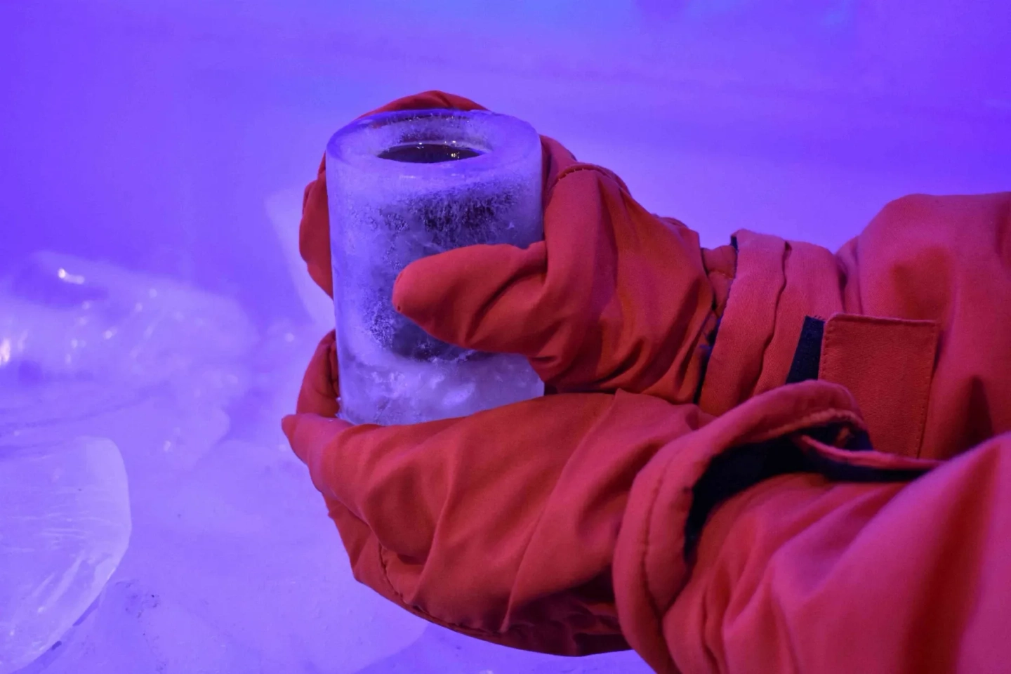 Una vez dentro, te sumergirás en un bar donde todo, desde las paredes y la barra hasta los vasos, está esculpido en hielo. Disfrutarás de un ambiente único a -10°C, con música y luces que crean una atmósfera vibrante. Es el momento ideal para brindar, tomar fotos memorables y vivir una aventura helada e inolvidable en familia o con amigos.