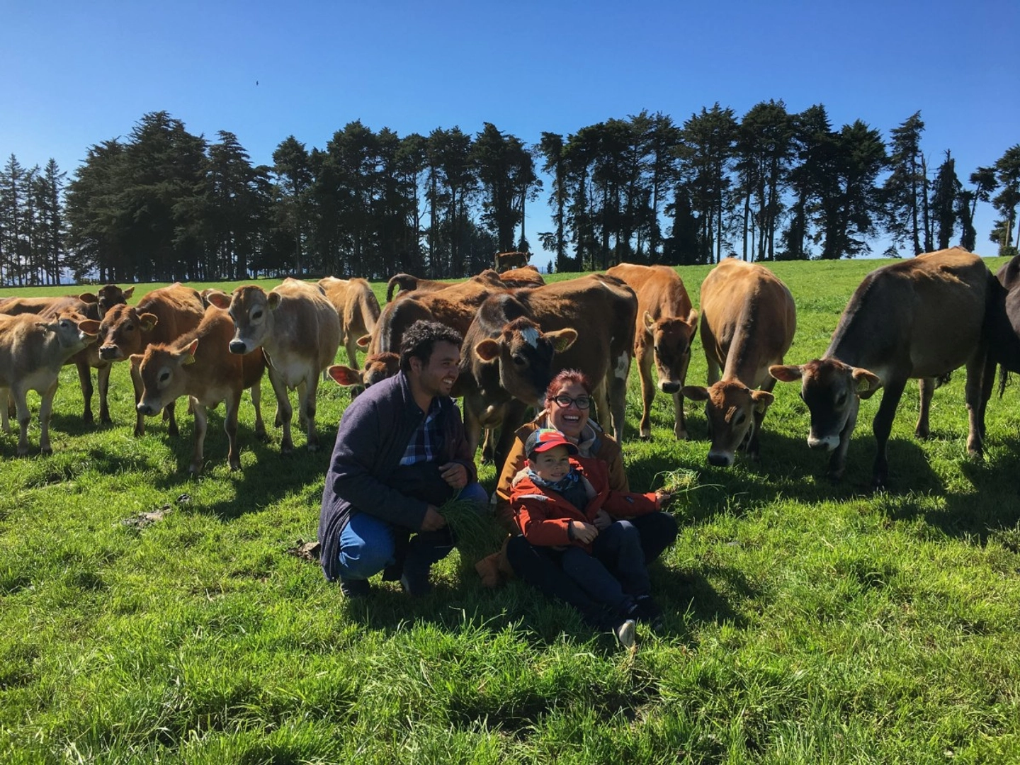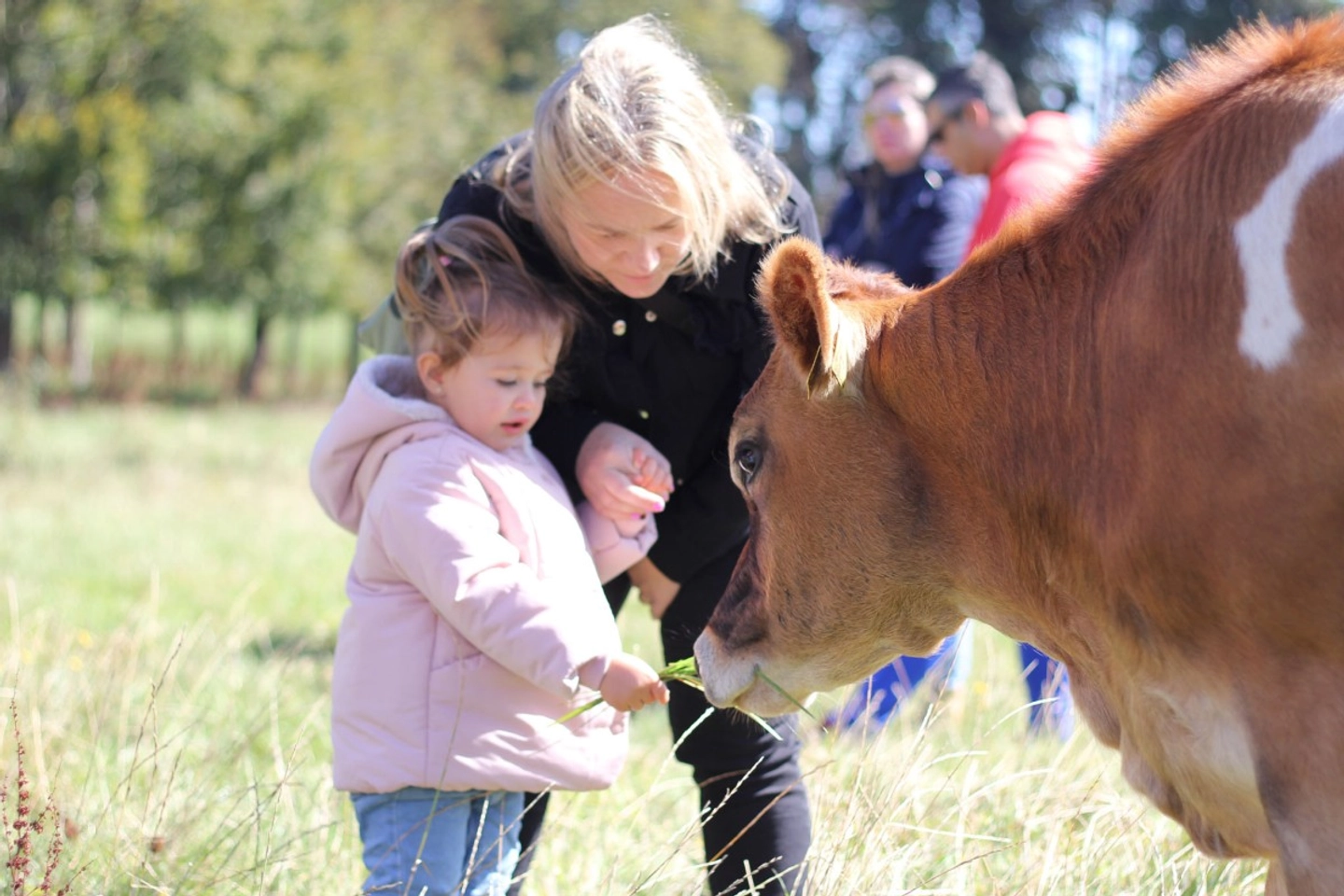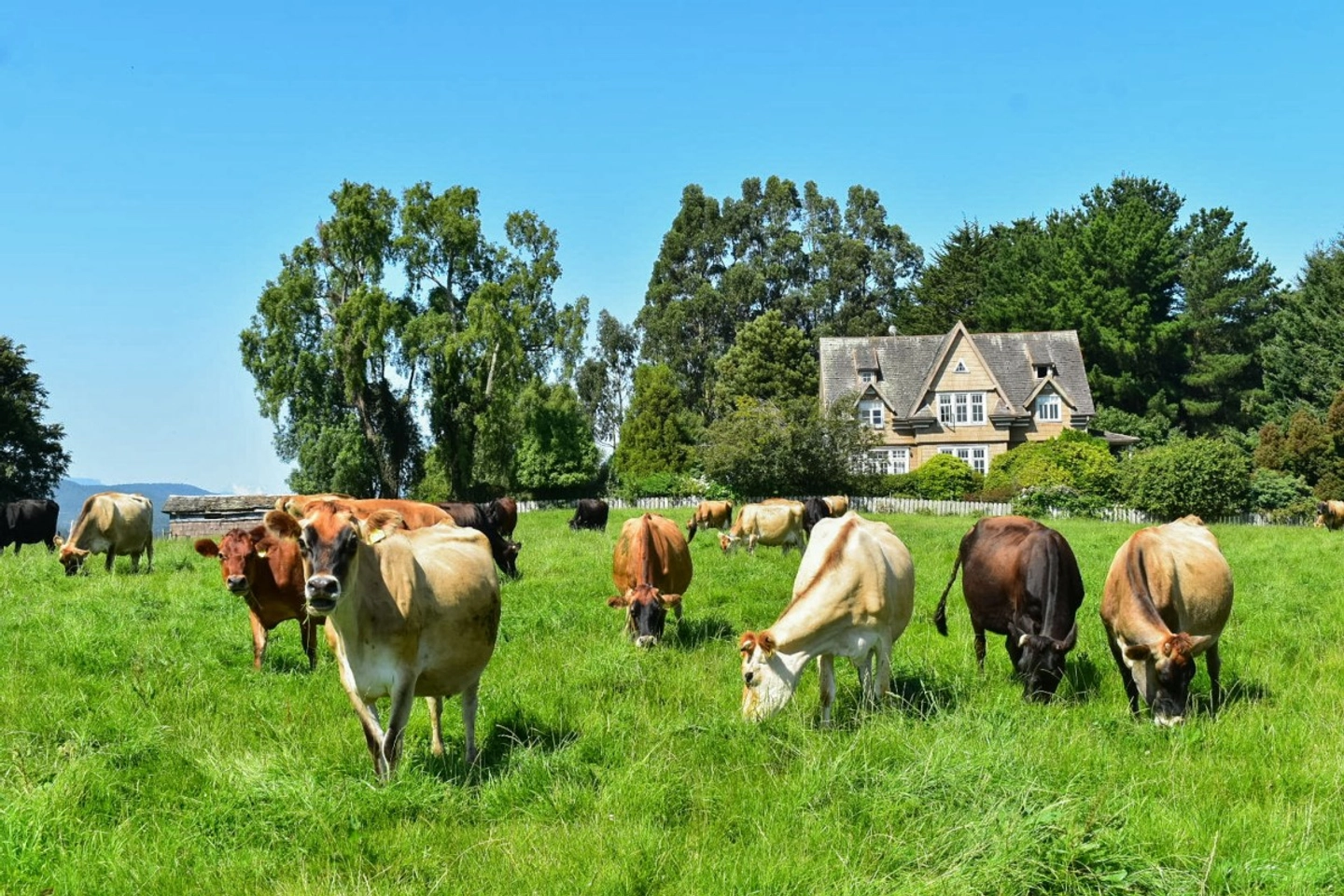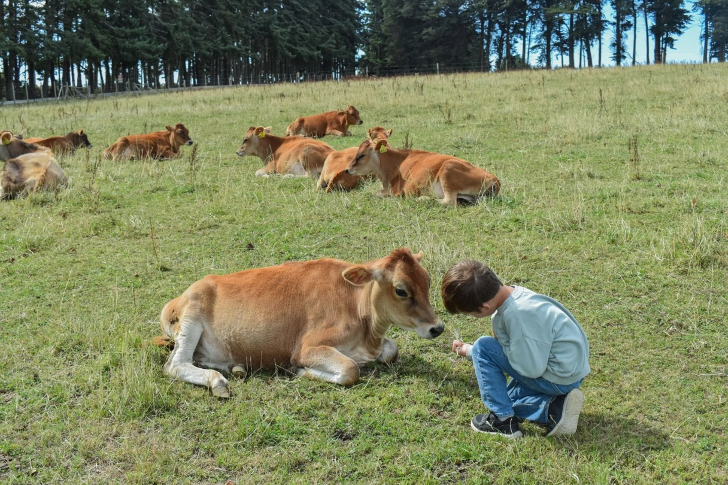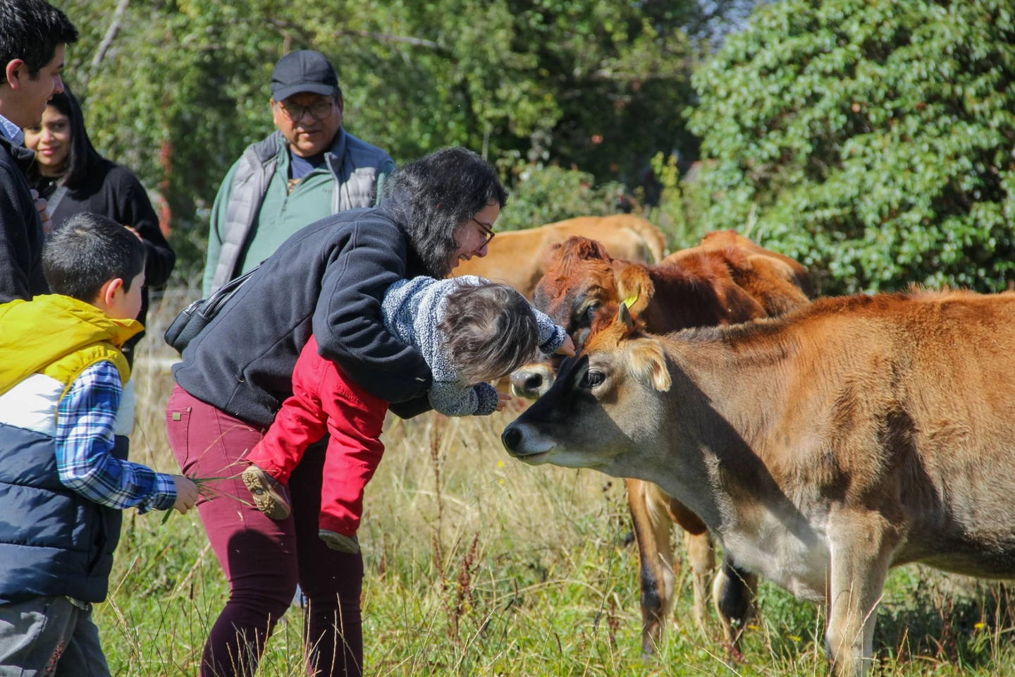 Visita guiada por las praderas, interacción con las vacas Jersey y explicación de los procesos de crianza y manejo sostenible.