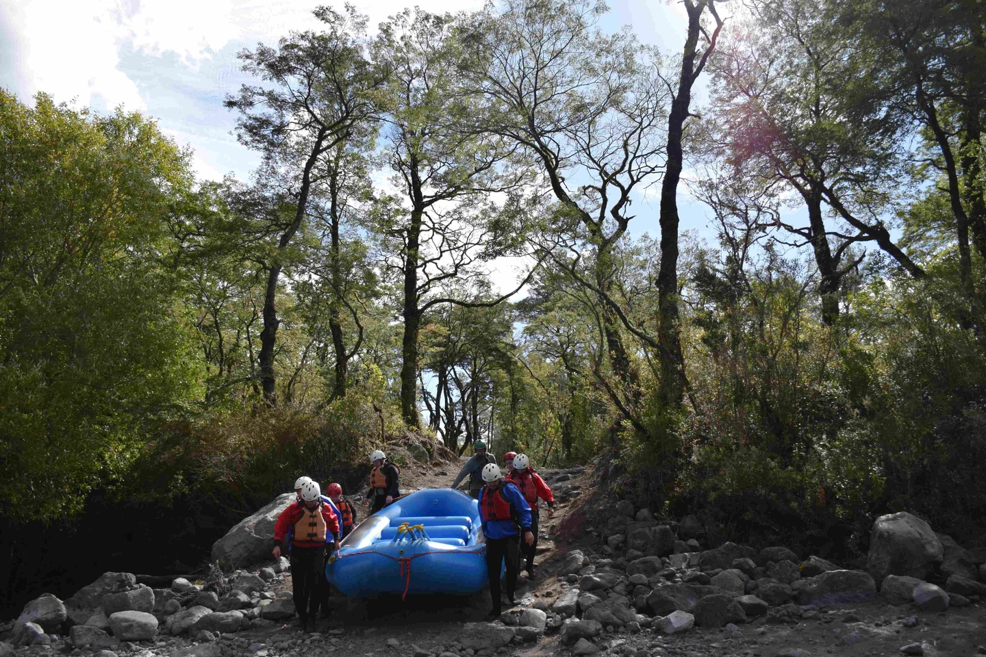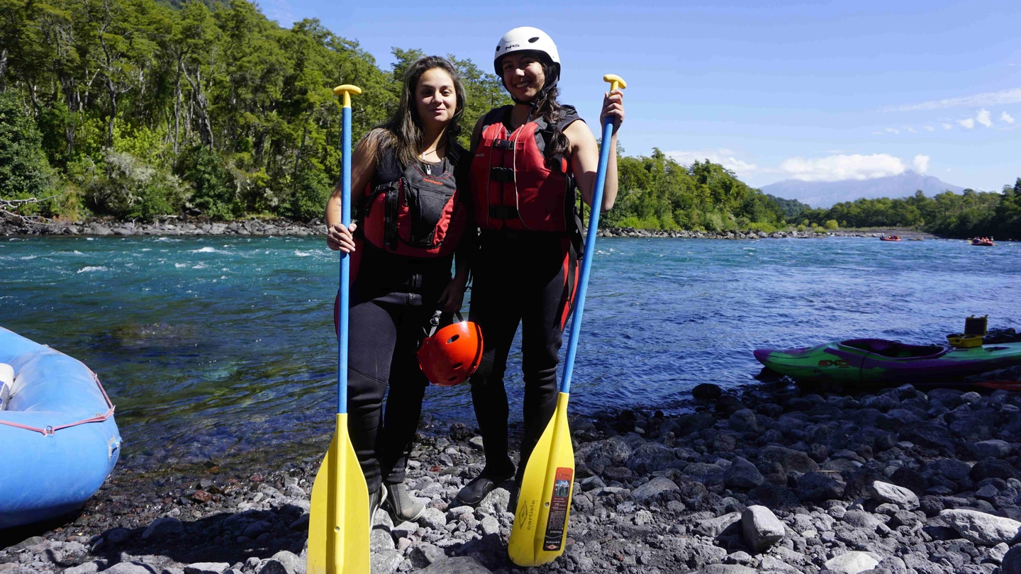 Comienzo del descenso por 8 km en rápidos clase III, en un tramo ideal para principiantes y rodeado de paisajes volcánicos y bosques nativos.