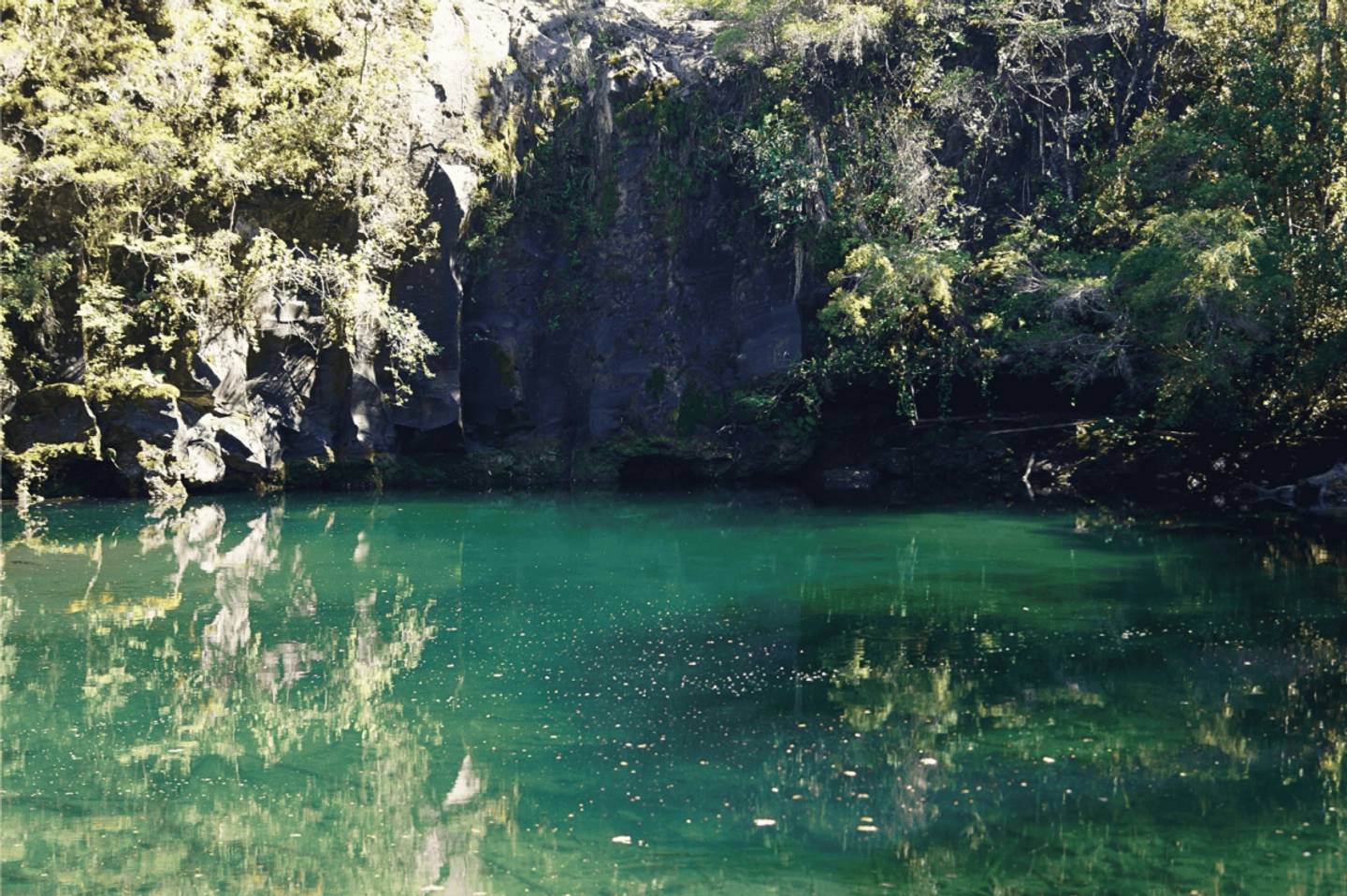 Una laguna rodeada de vegetación nativa, con aguas de un verde intenso debido al desarrollo de microalgas. Un sendero accesible para sillas de ruedas permite llegar a la laguna después de un recorrido corto de 200 metros.