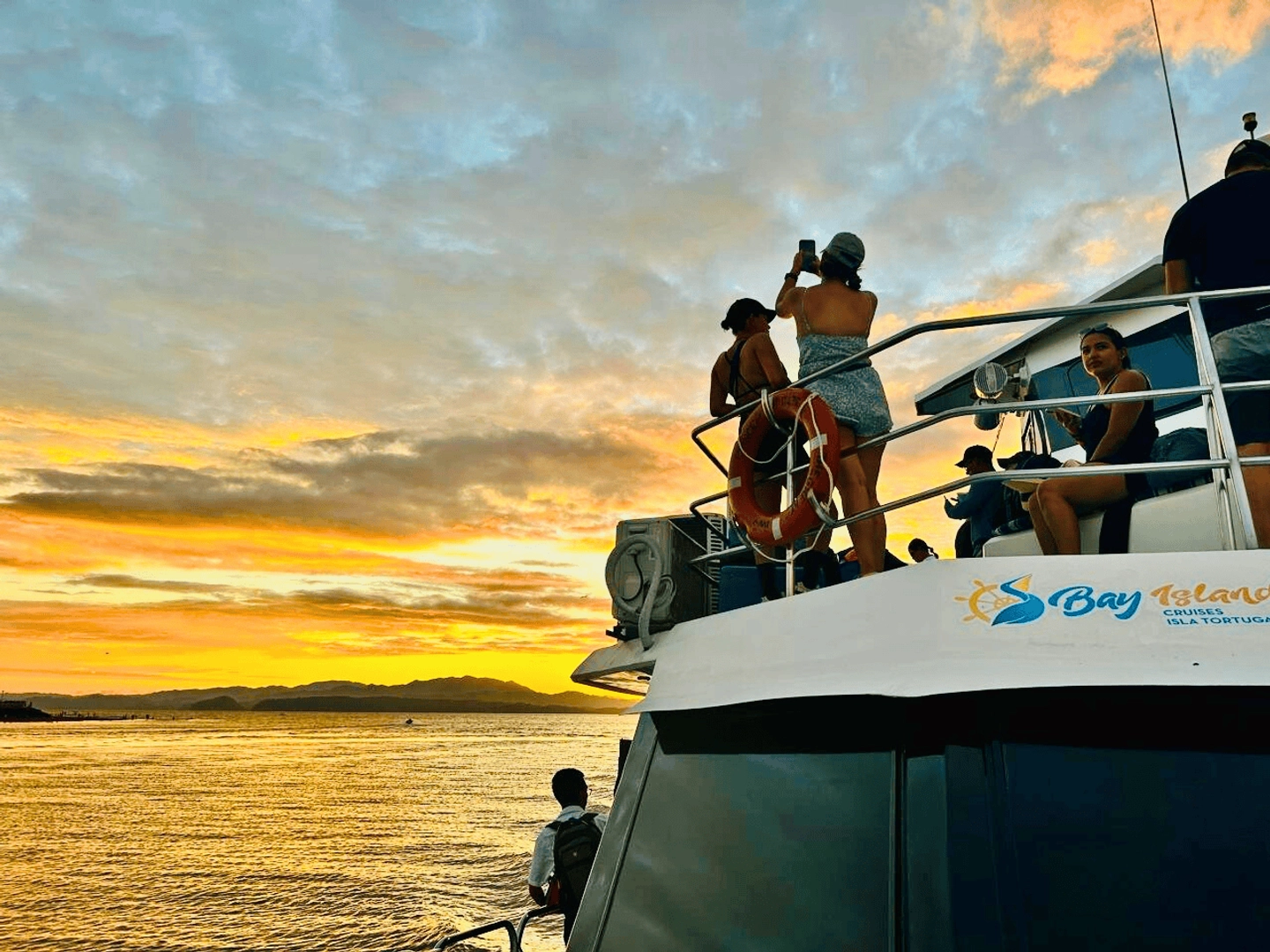 Iniciamos el regreso al puerto de Puntarenas disfrutando de la brisa marina y el atardecer.