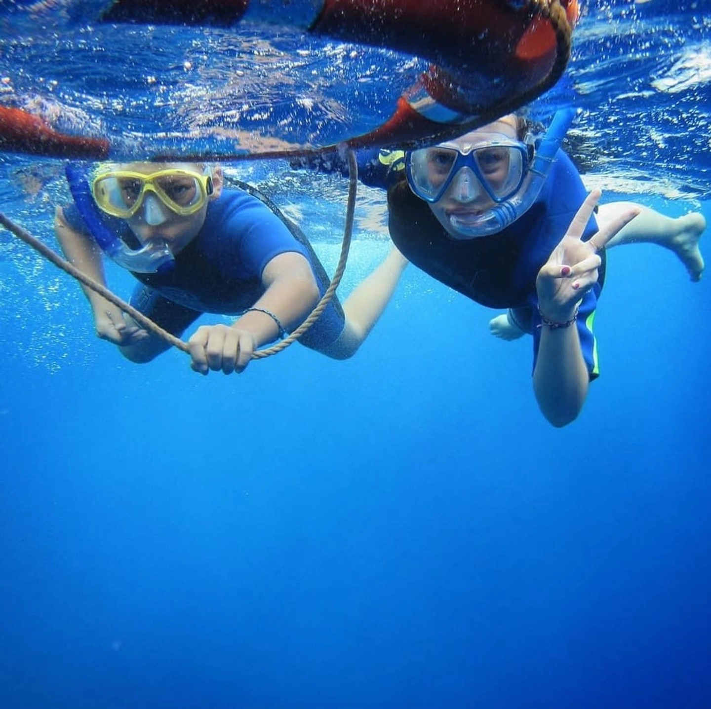Actividad de snorkeling en arrecifes de coral, con fauna marina diversa y tortugas.