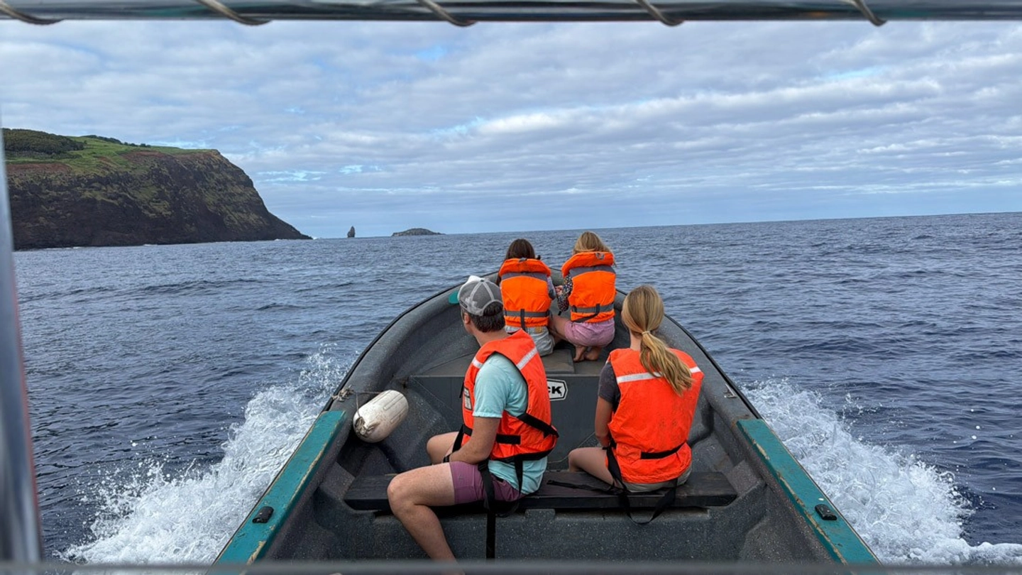 Recepción de los turistas, entrega de salvavidas e impermeable. Posterior zarpe hacia los Motu.