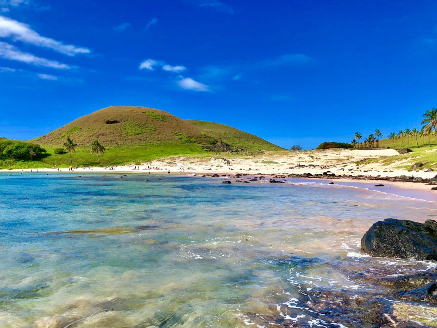 Playa icónica con moais restaurados y arena blanca.