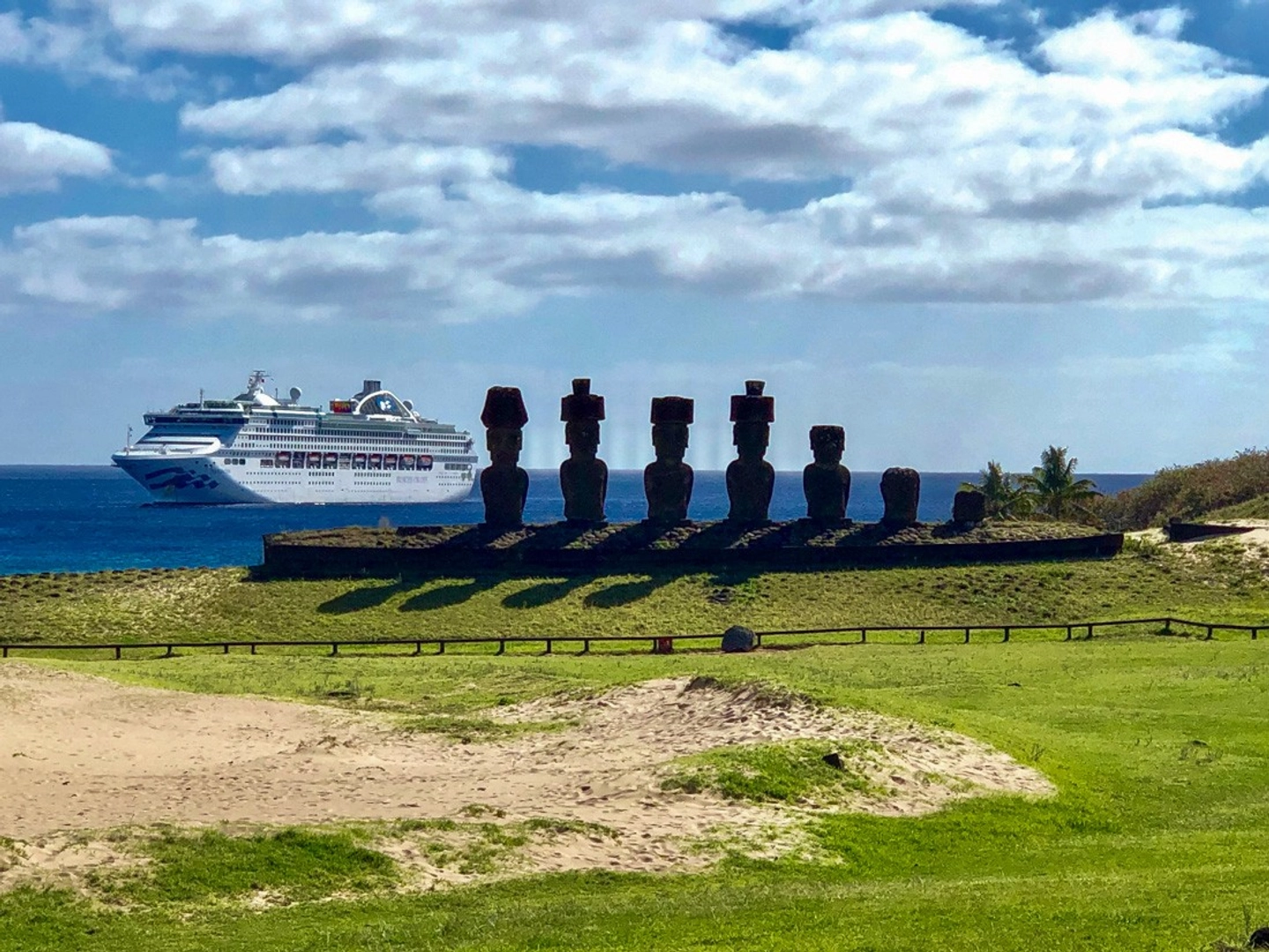 Plataforma con 15 moais alineados frente al océano.