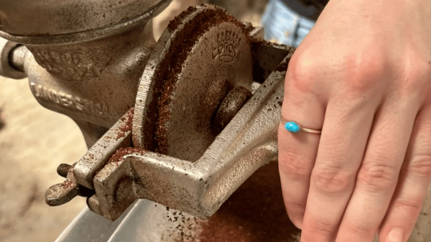 Explicación de las etapas que recorre el grano después de la recolección, incluyendo lavado, fermentación, secado, trillado y molienda, con muestra de parte del proceso de forma tradicional.