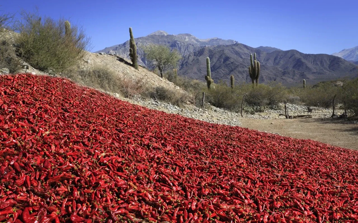 Visita a las tiendas de comestibles y paso por la ciudad donde los pimientos se secan al lado de la carretera.