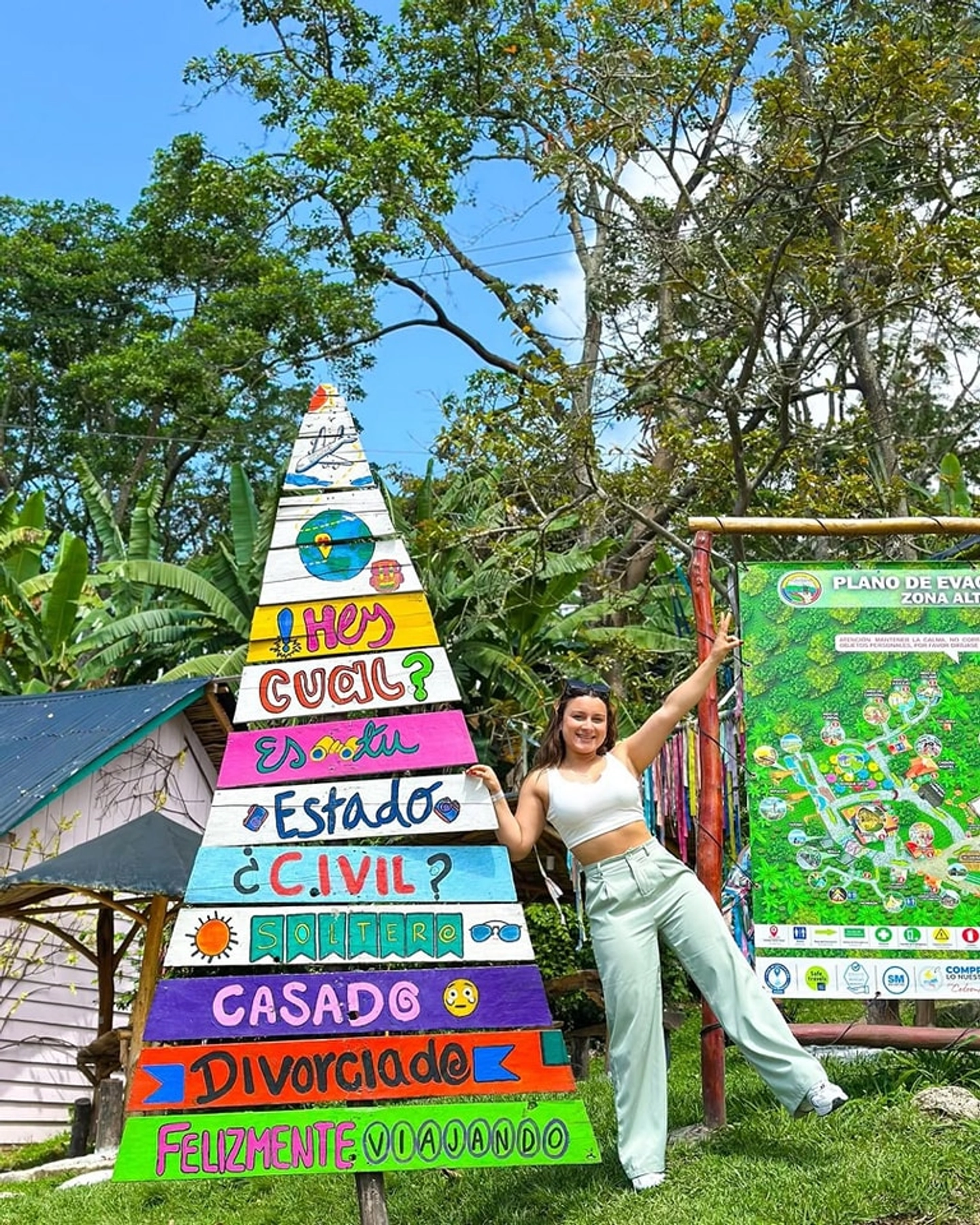 Parada en una estructura elevada tipo casita del árbol con vistas al paisaje natural.