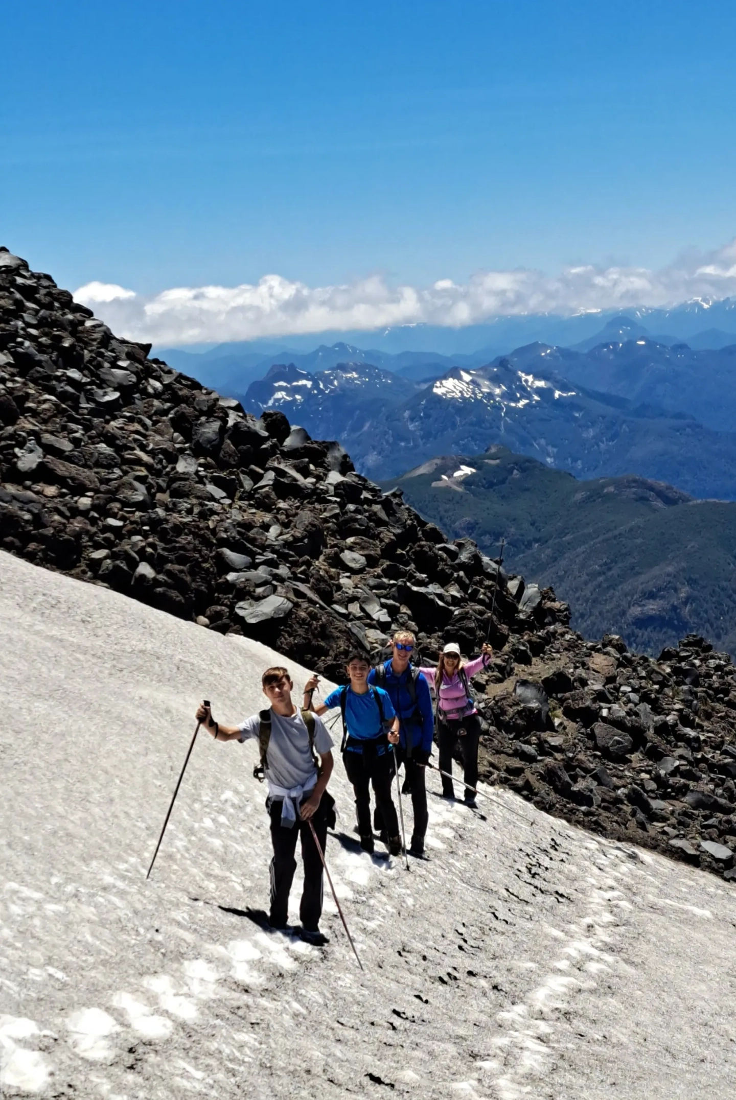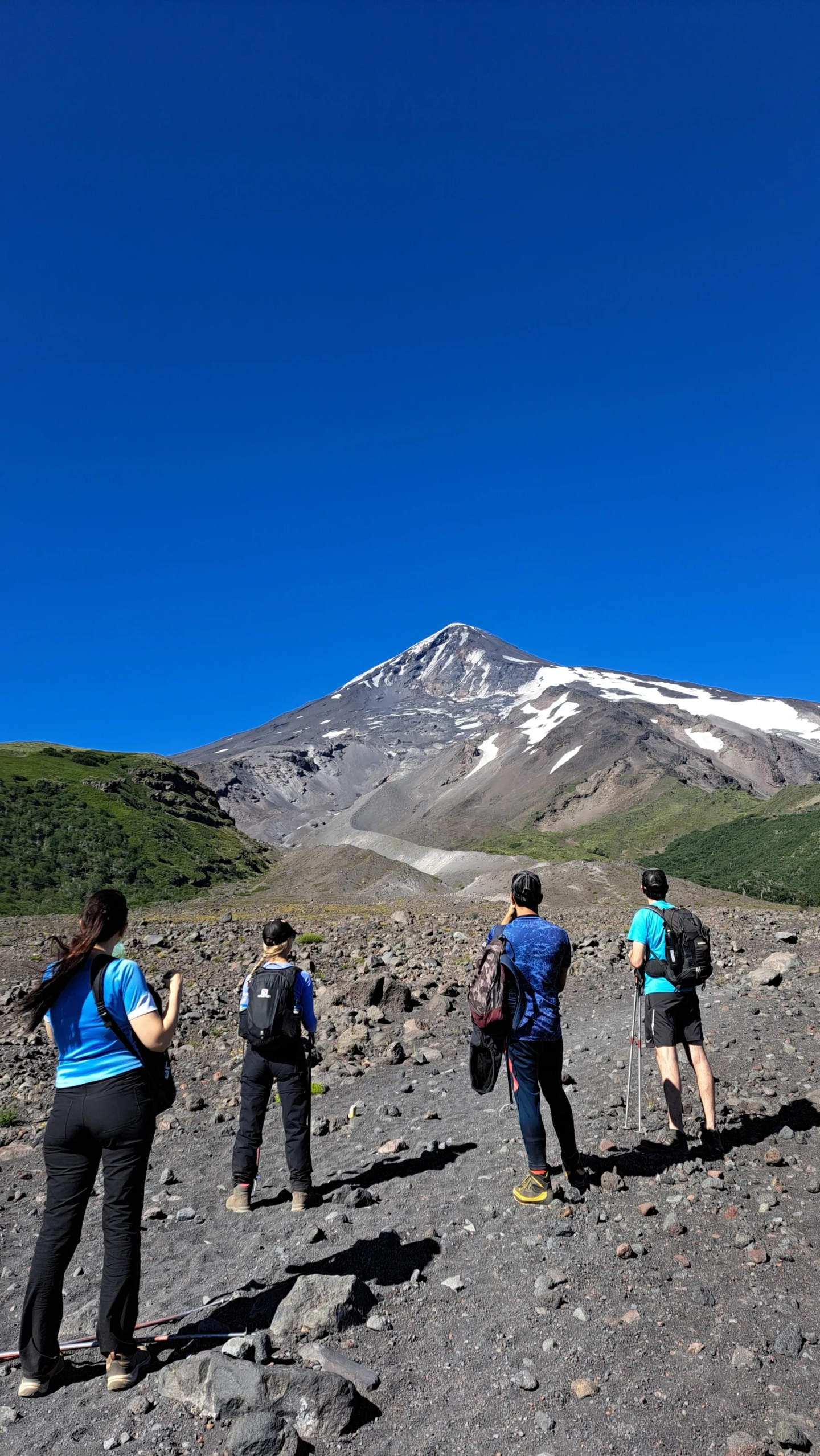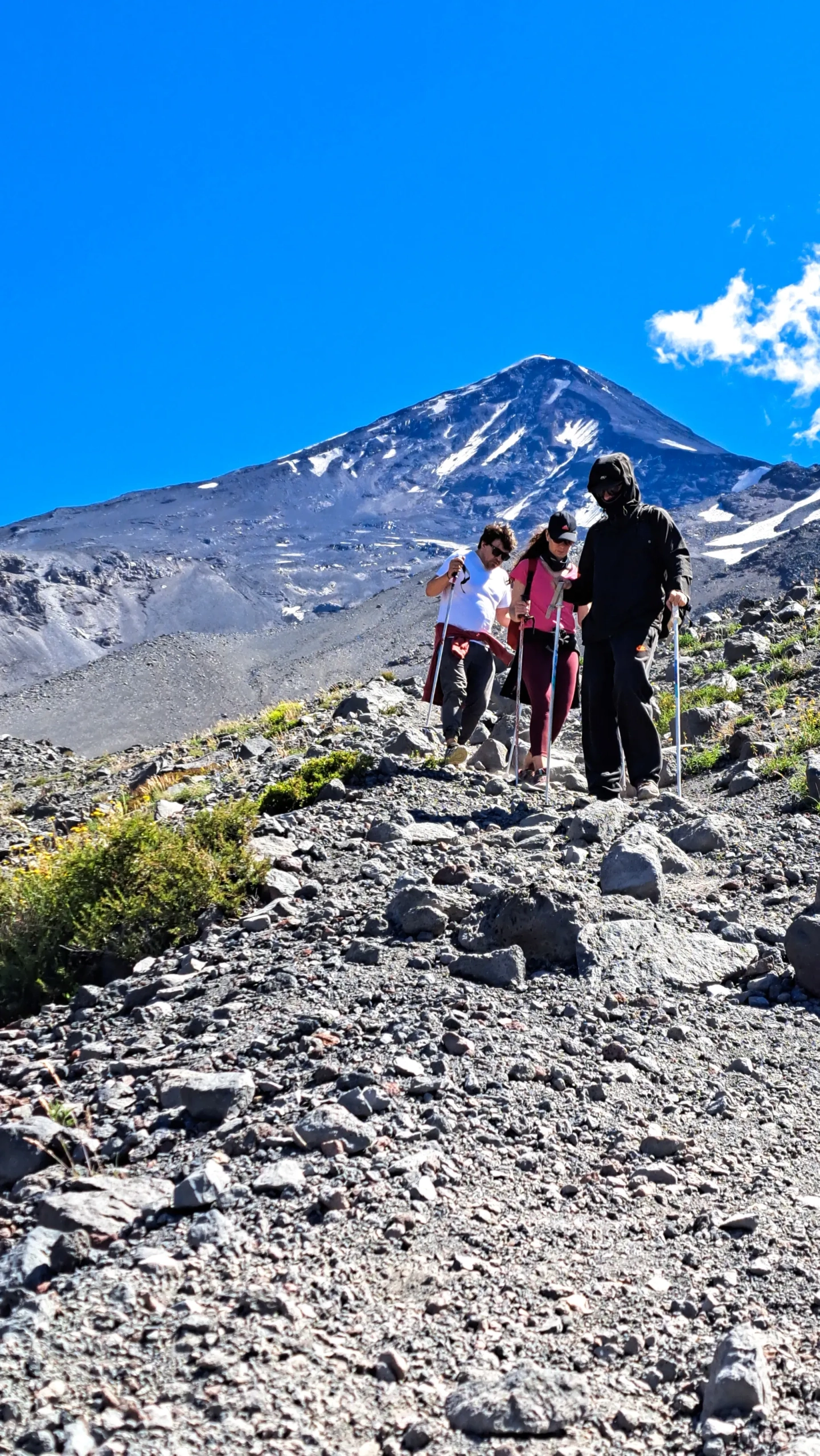 La travesía comienza en la base del volcán, entrando en un sendero que serpentea por un característico bosque patagónico de lengas y araucarias. A medida que se gana altitud, el terreno cambia drásticamente, dejando atrás la vegetación para dar lugar a un impresionante paisaje de escoria volcánica. Este tramo representa el principal desafío físico del día, exigiendo un esfuerzo constante para navegar por el terreno suelto y empinado.