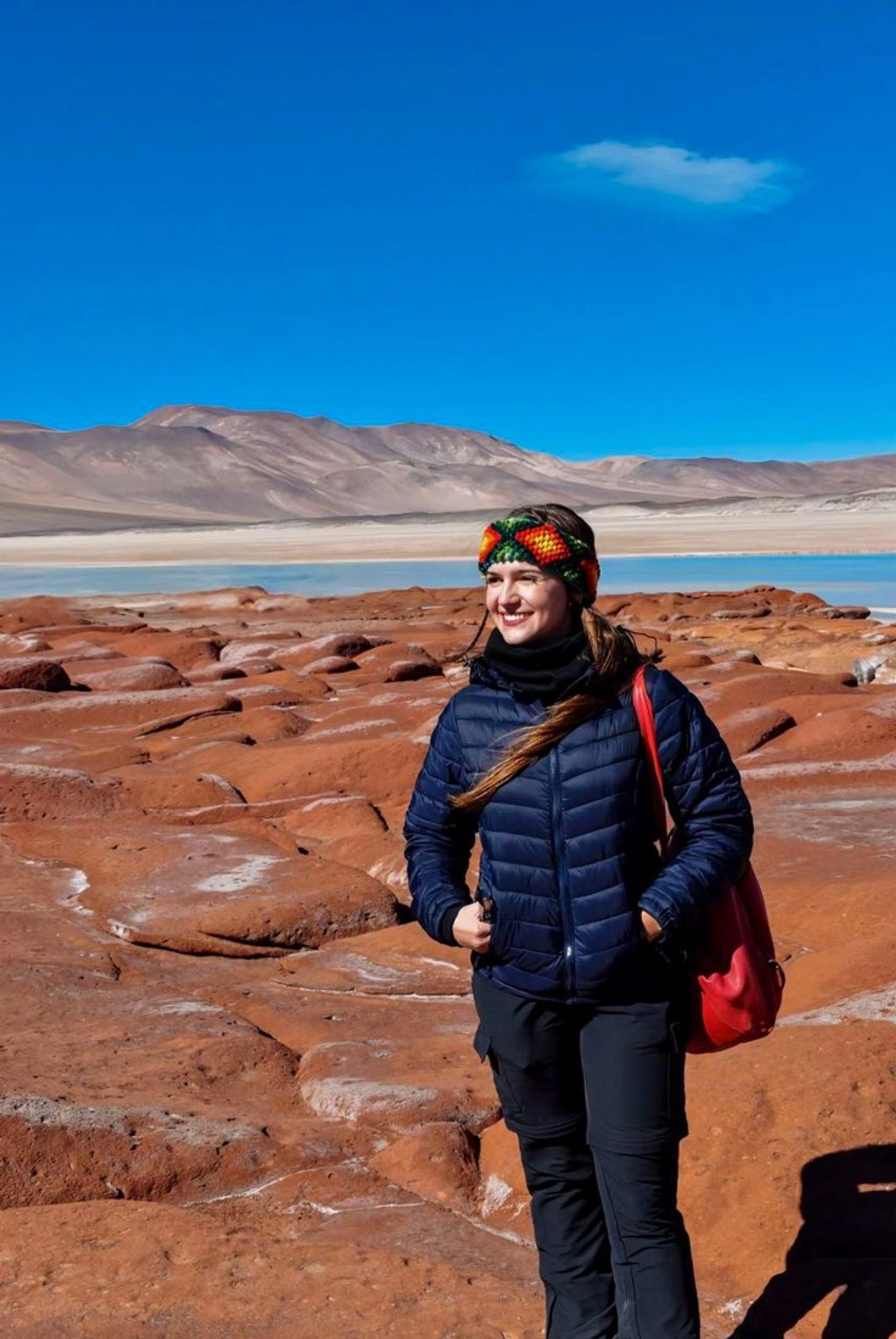 Vista panorámica de formaciones volcánicas rojizas y lagunas andinas