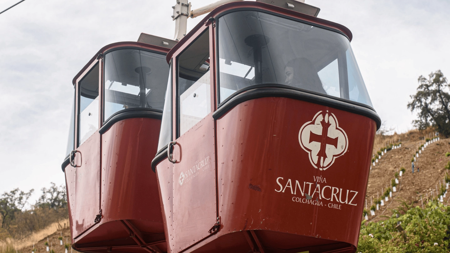 El recorrido sigue con un ascenso autoguiado en teleférico hacia el Cerro de las Culturas, desde donde se obtiene una vista elevada del Valle de Colchagua y del entorno de los viñedos.