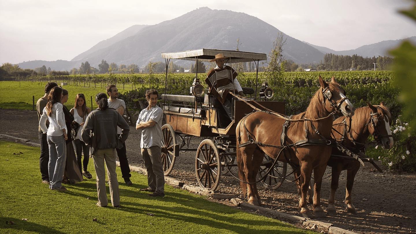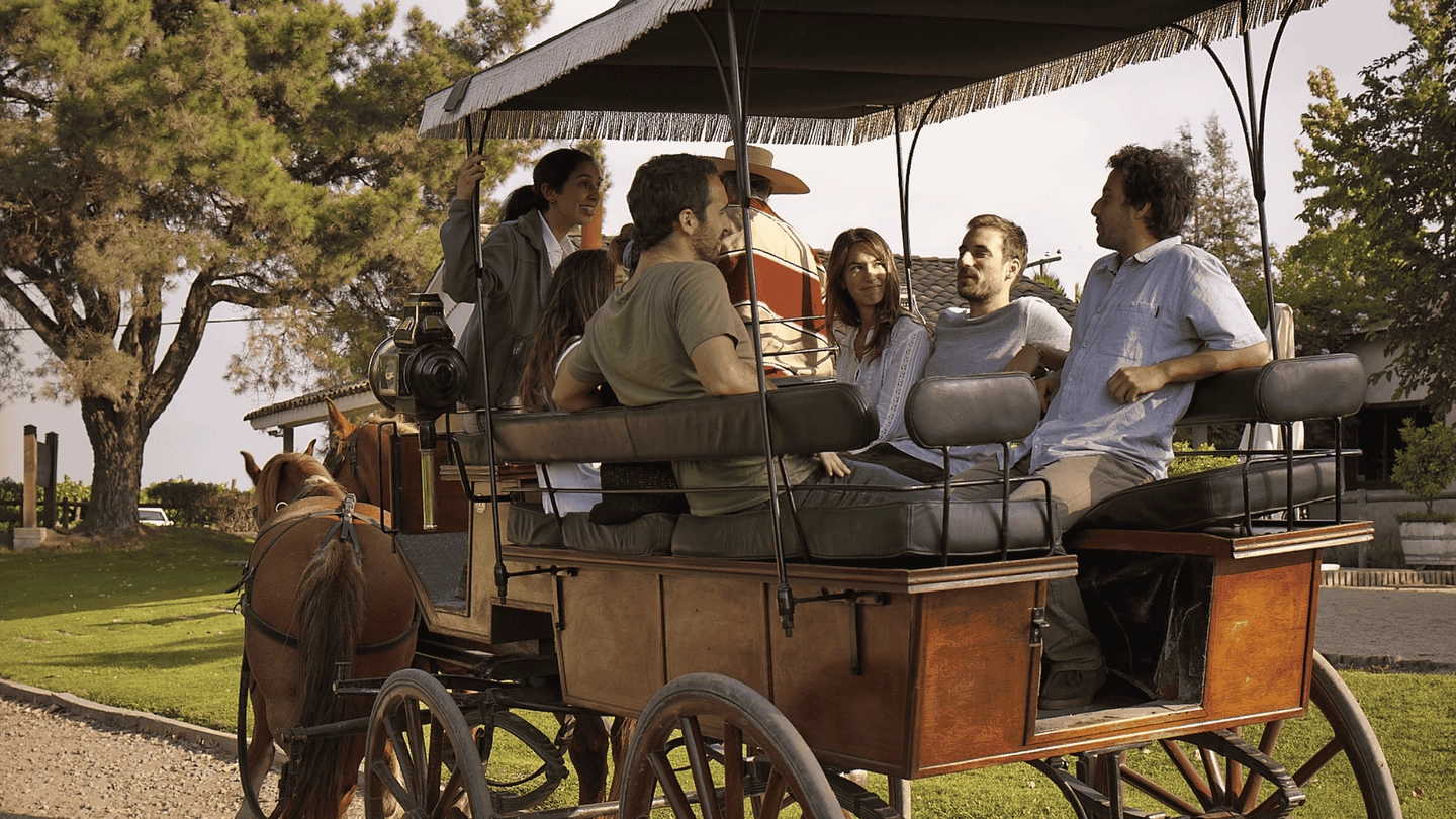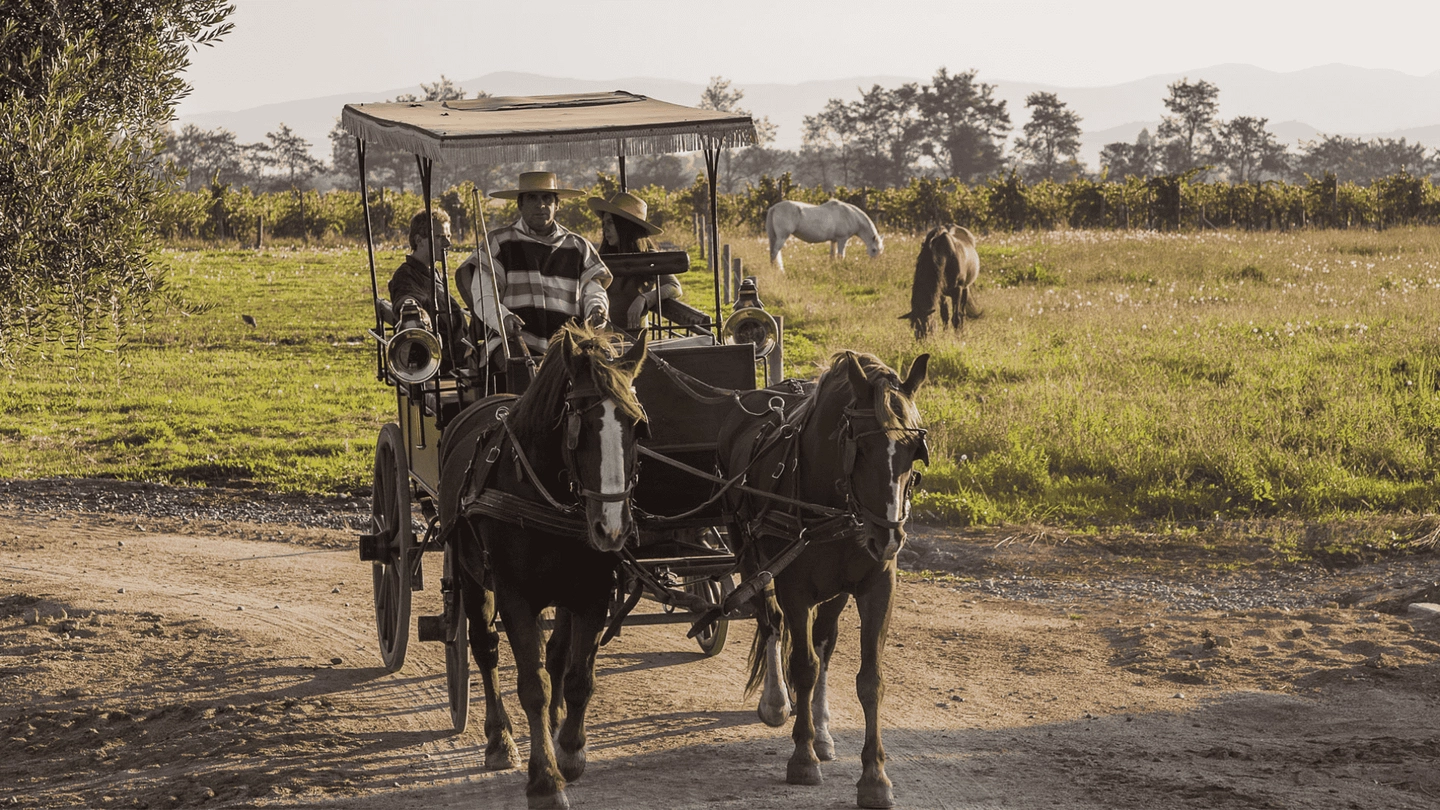 Trayecto en coche tirado por caballos a través de los viñedos, con vistas al paisaje del Valle de Colchagua.