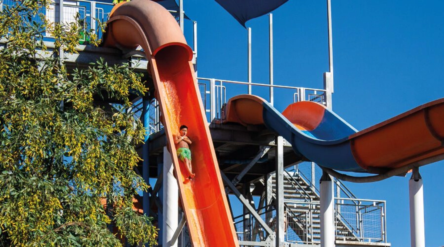 Tiempo libre para disfrutar de la piscina con olas, los diversos toboganes y las zonas de descanso en el sector El Oasis.