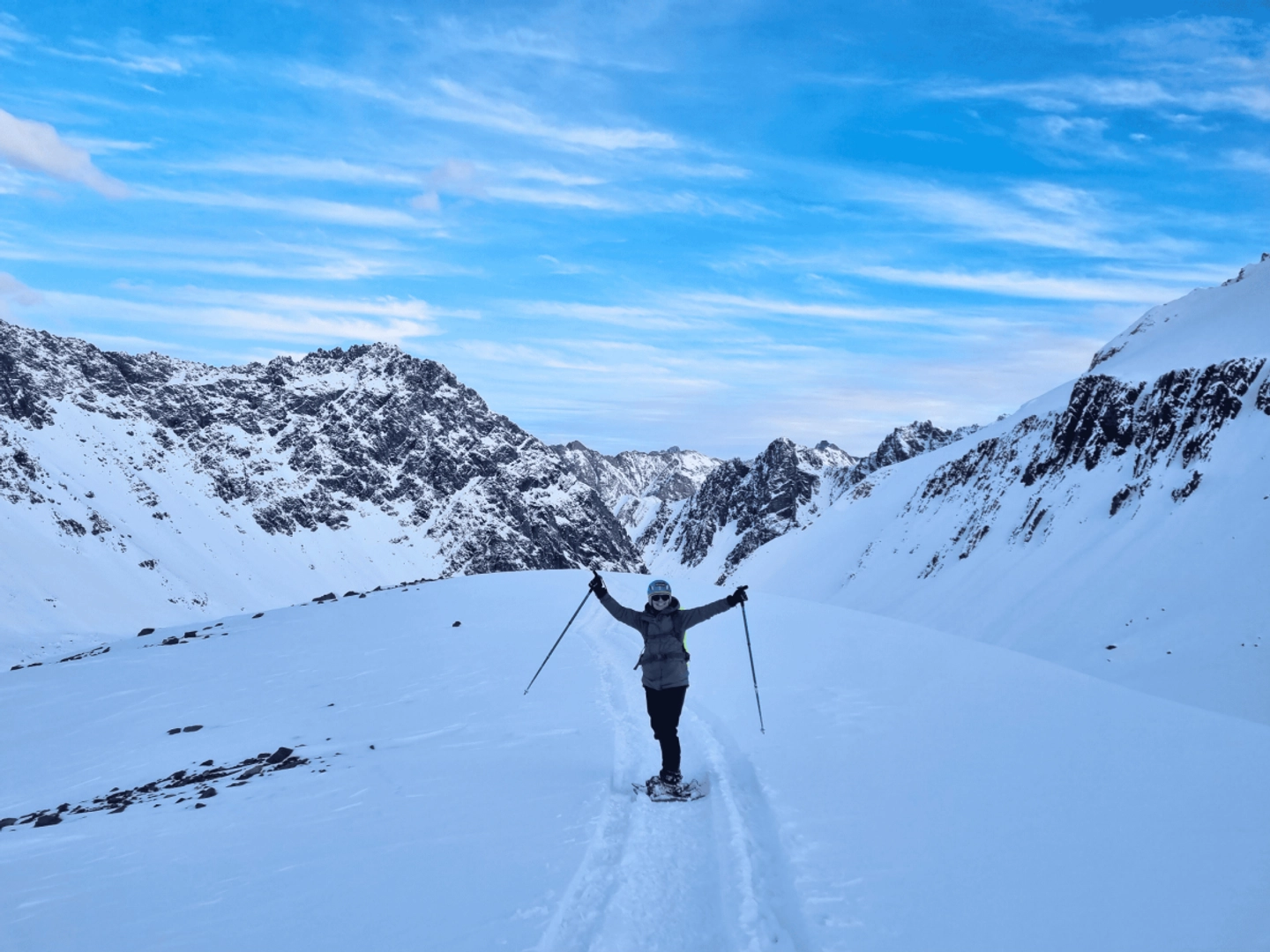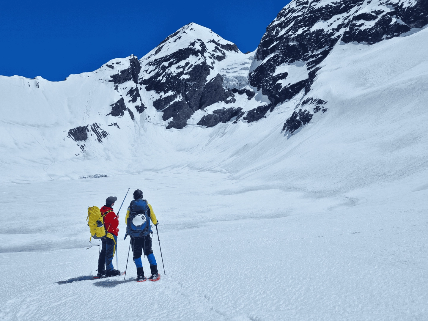 Caminata hasta el Glaciar Colgante, ubicado a 3237 msnm, rodeado de imponentes montañas.