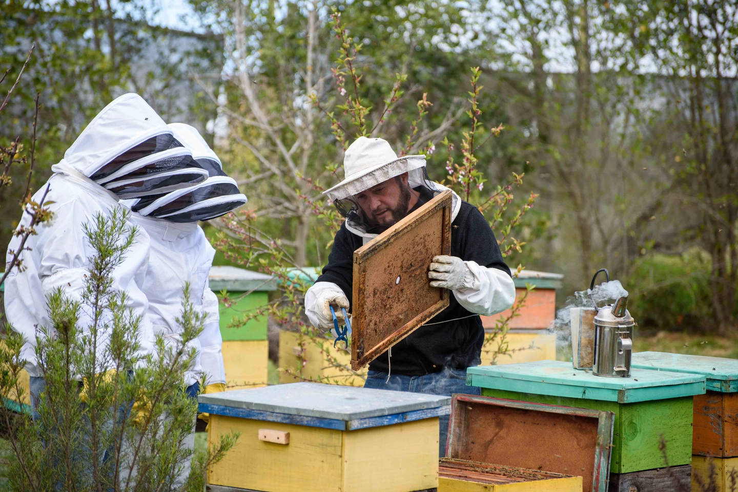 Equipamiento con trajes de seguridad y visita directa a las colmenas para observar el trabajo de las abejas.