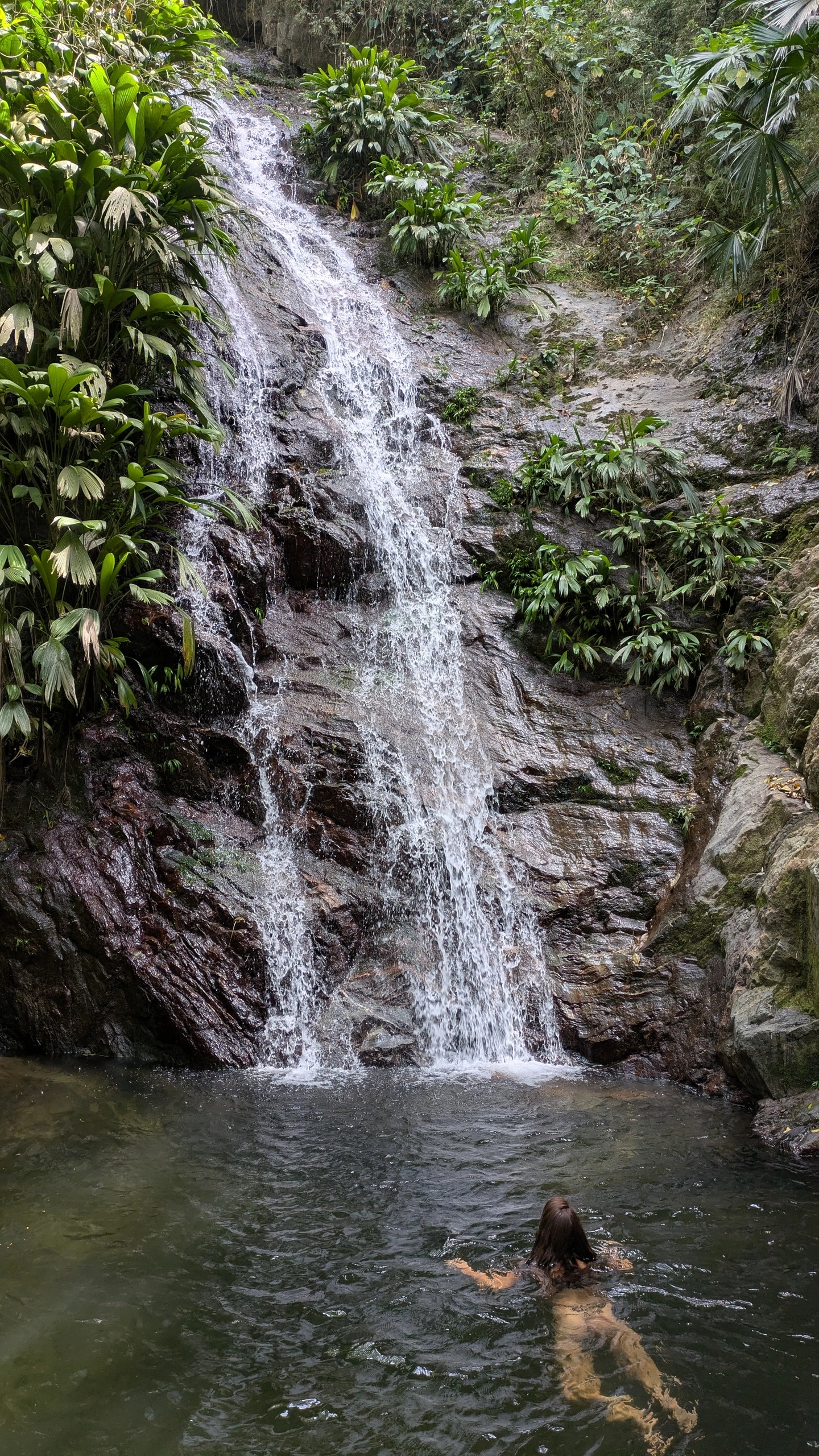 Caminata ecológica hasta una cascada de aproximadamente 30 metros de altura, rodeada por vegetación tropical.