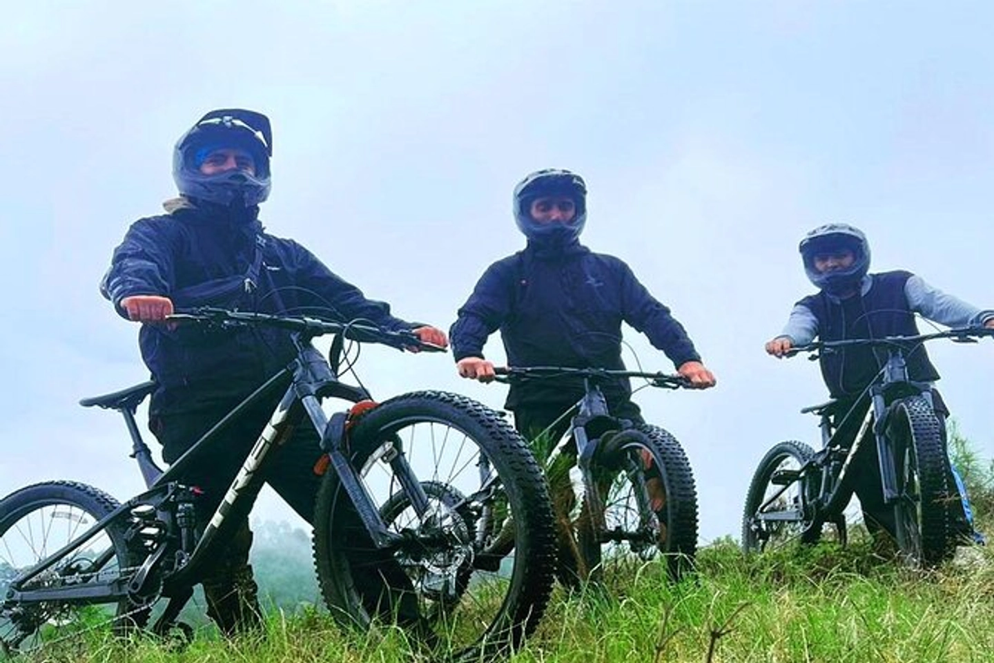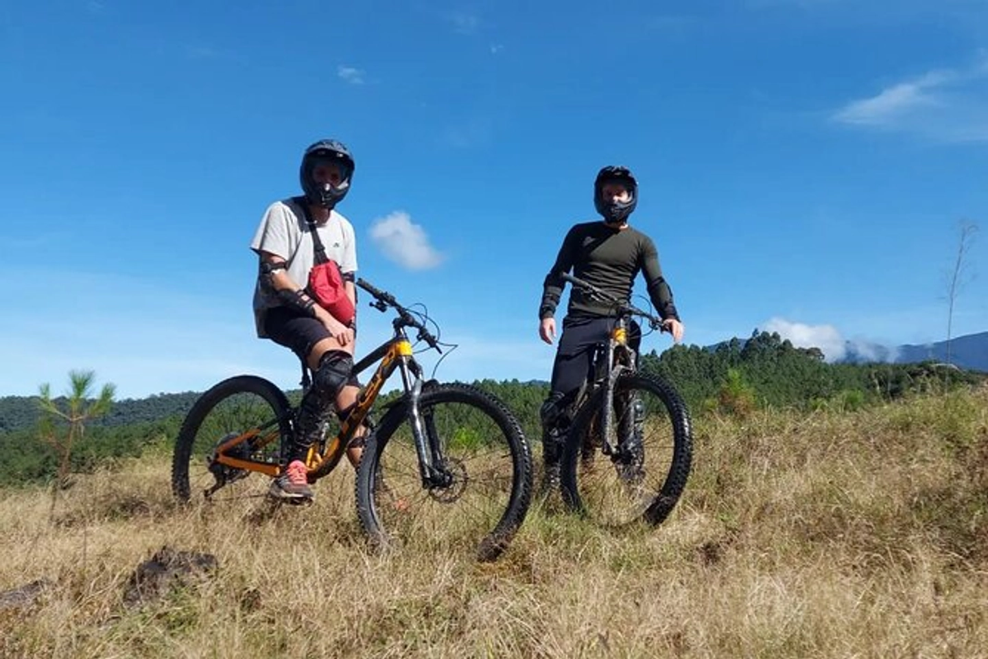 Entrega de bicicleta de montaña, elementos de protección personal e indicaciones del guía experto en ciclismo.