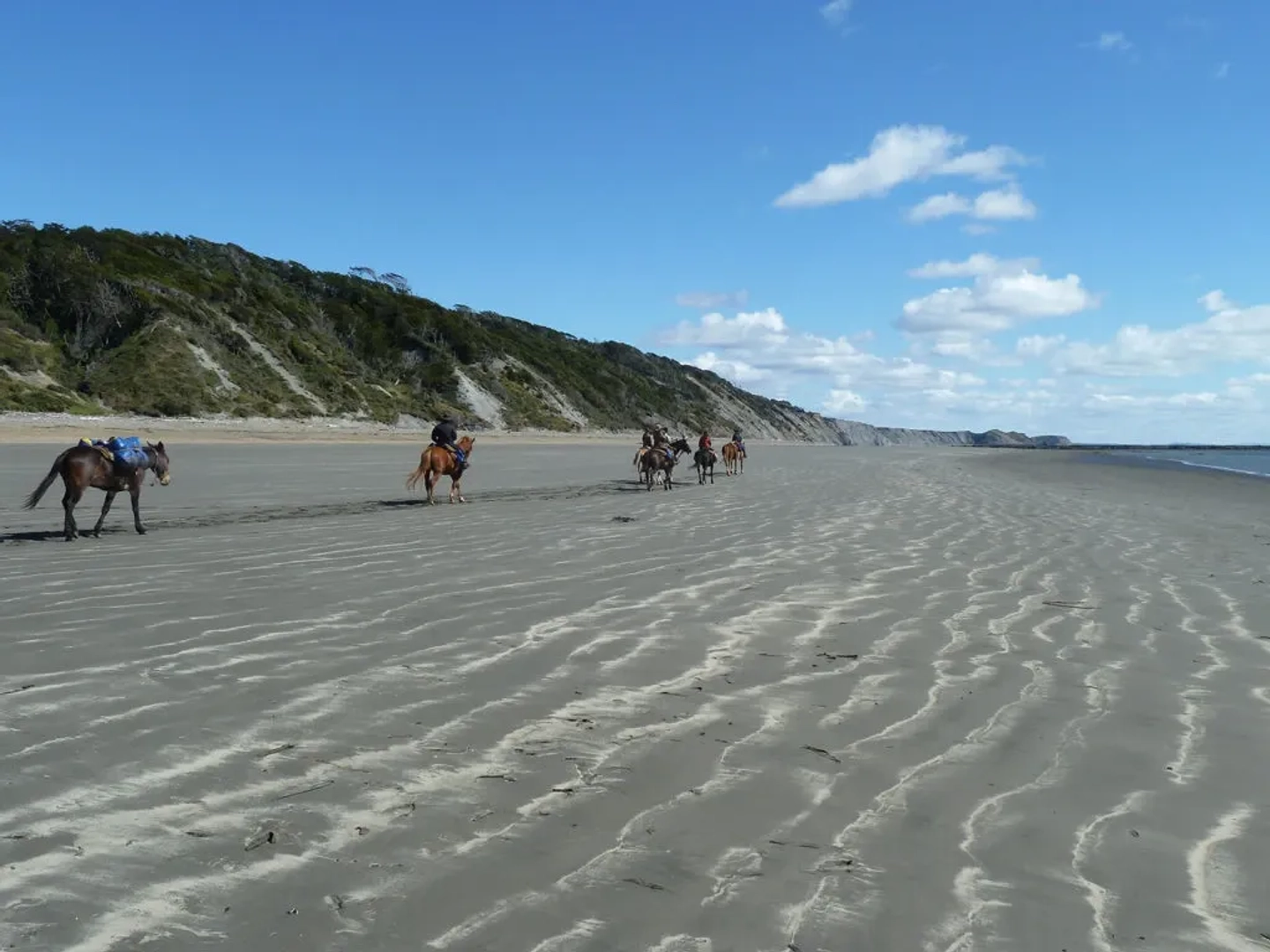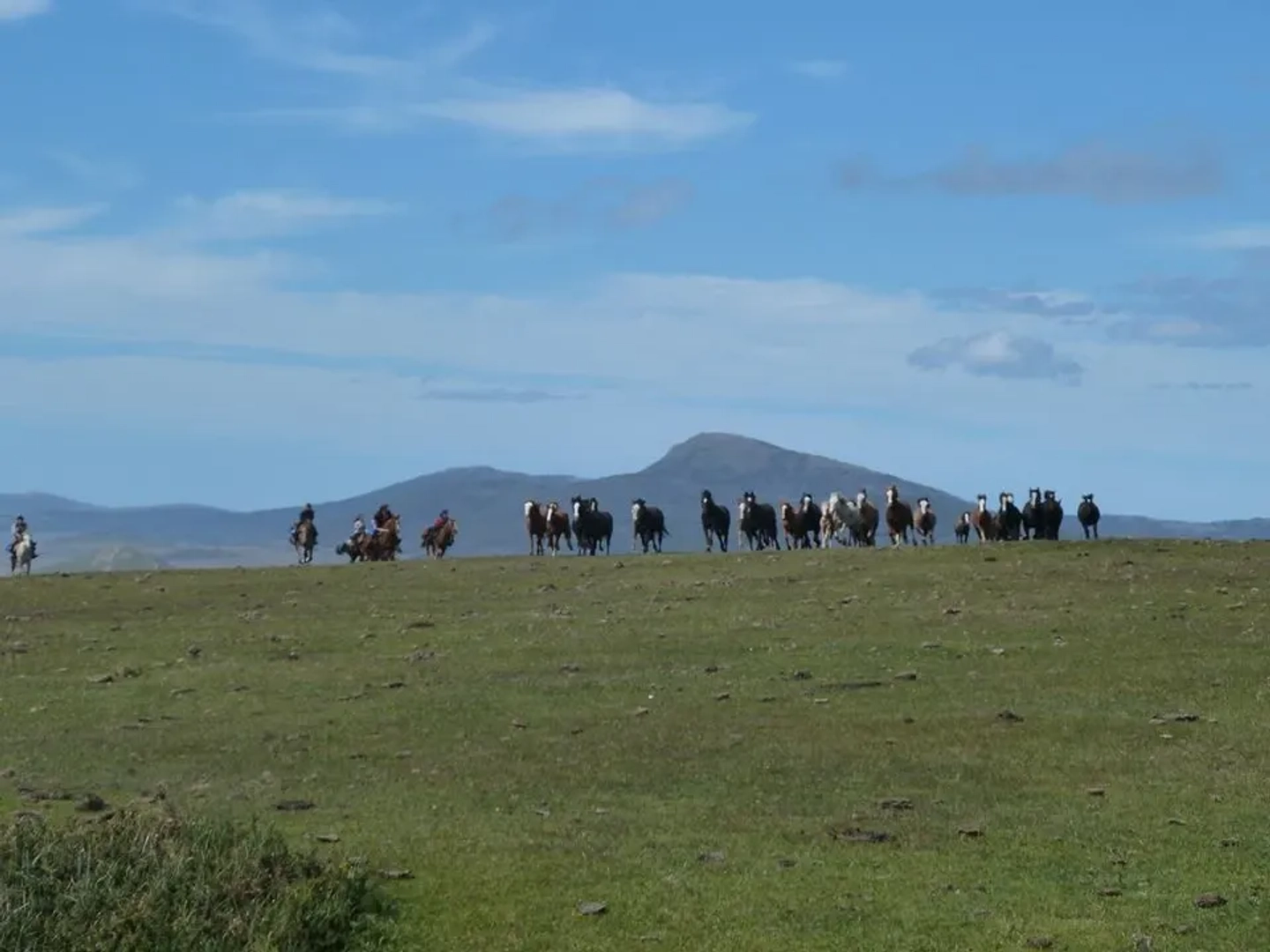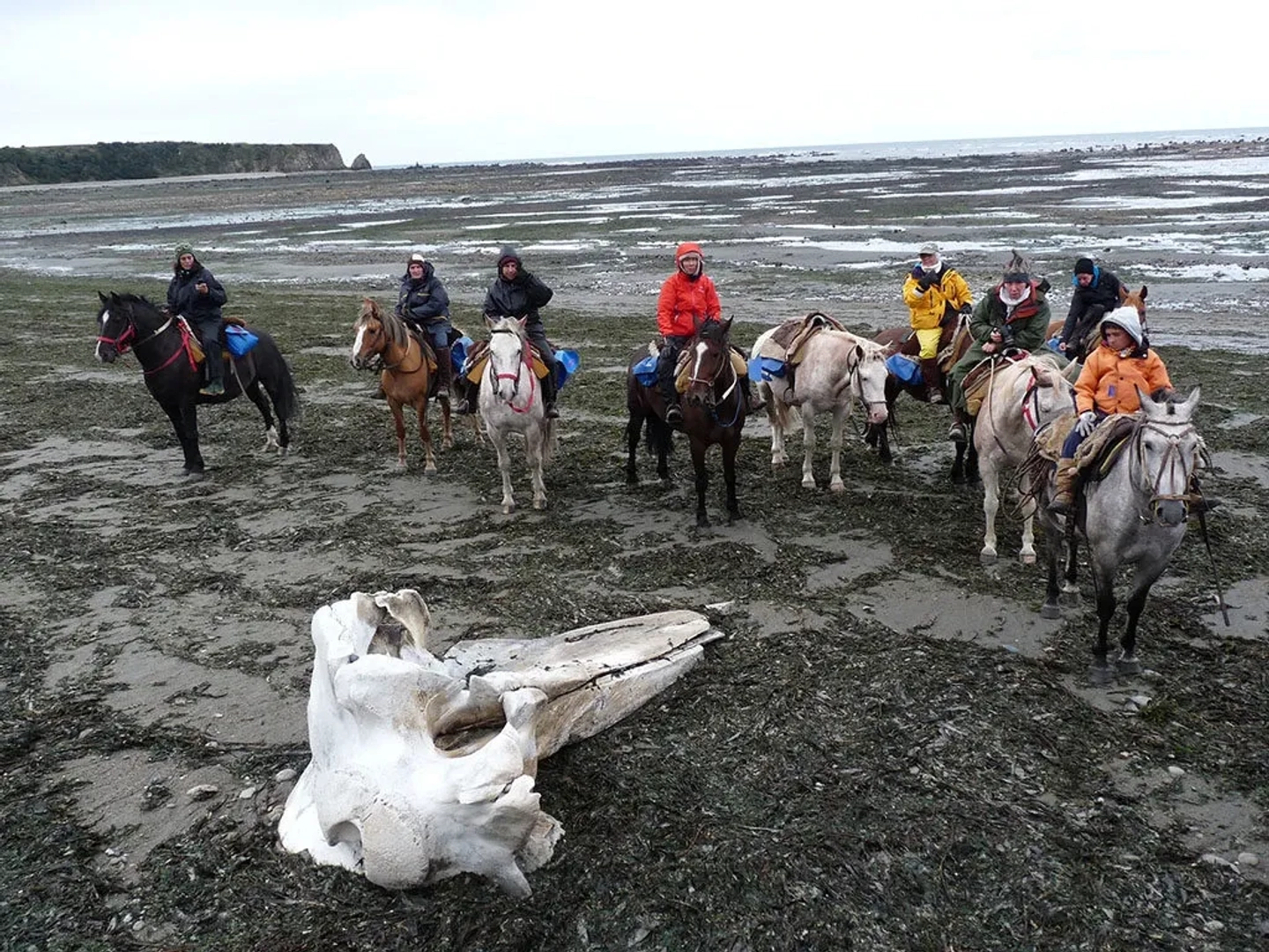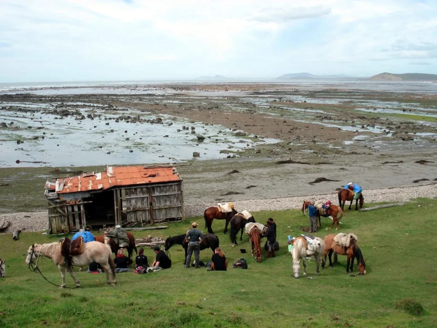 Luego de preparar los caballos y la carga, lentamente dejaremos la caleta “Falsa” y cruzaremos nuevamente un importante terreno de turba para arribar a la costa en dirección al Río Policarpo (el más ancho y peligroso de nuestra expedición). Una vez que crucemos este imponente río, se abrirán ante nosotros las playas más extensas de todo el recorrido (Donata y Bahía Policarpo). En ellas podremos disfrutar de largos galopes sintiendo una inigualable sensación de libertad. Podremos acercarnos a grandes grupos de caballos salvajes en su hábitat natural. Nos permitiremos una pausa en el antiguo casco de la Duquesa de Albania para descansar, comer y tener el tiempo para nuevas fotografías. En el camino hacia el Puesto Río Bueno se suceden otras playas separadas por pequeños cabos, cubiertos de pasto en donde se alimenta el ganado de la región. El puesto nos espera con su pequeño y precario confort pero suficiente para disfrutar de nuestro merecido descanso y cena. A partir de este día la carga es menor y más liviana. Por esta razón nos permitiremos realizar marchas más rápidas (trotes, galopes). Pernocte: Refugio / Carpa